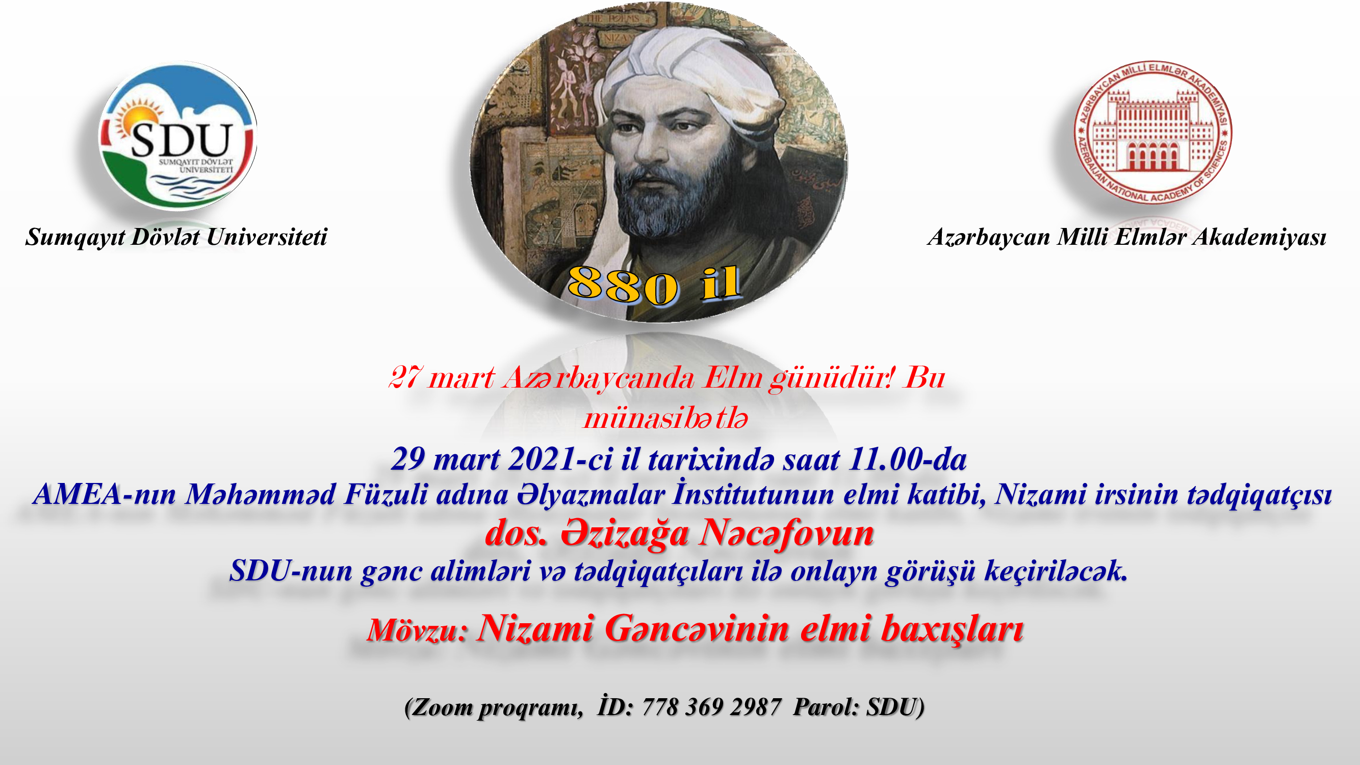 Sumqayıt Dövlət Universiteti və Azərbaycan Milli Elmlər Akademiyasının birgə təşkilatçılığı 27 mart Azərbaycanda “Elm günü” münasibəti ilə Nizami Gəncəvinin 880 illiyinə həsr edilmiş "Nizami Gəncəvinin elmi baxışları" mövzusunda onlayn görüş keçiriləcək