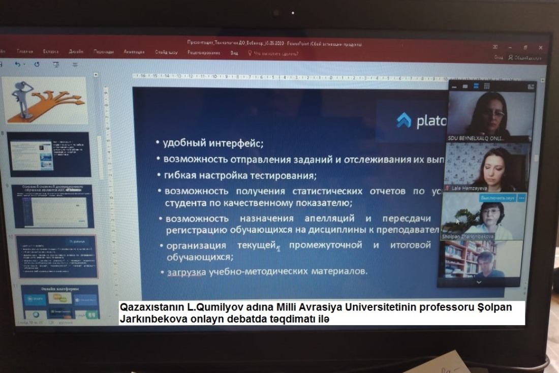 Qazaxıstanın L.Qumilyov adına Miili Avrasiya Universitetinin professoru Şolpan Jarkınbekova işlədiyi universitetdəki onlayn tədris haqqında çox maraqlı slayd və təqdimatla çıxış etdi. Auditoriyanın suallarını cavablandıraraq, mövcud problemləri açıqladı.