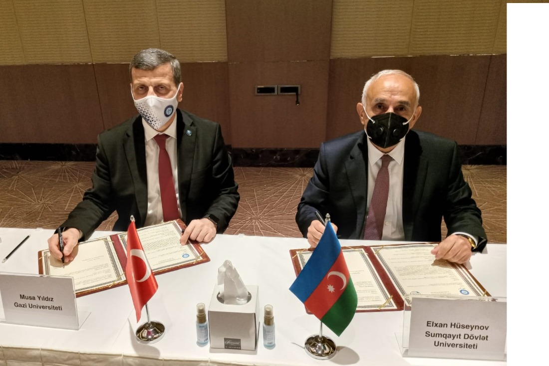 Sonra Sumqayıt Dövlət Universiteti ilə Qazi Universiteti arasında əməkdaşlıq protokolu imzalandı. SDU-nun rektoru professor Elxan Hüseynov SDU ilə Qazi Universiteti arasında əməkdaşlığın əhəmiyyətindən və qardaş ölkənin ali təhsil sahəsindəki böyük təcrübəsindən faydalanmaq imkanlarından bəhs etdi. Ölkə başçısı cənab İlham Əliyevin ali təhsilin inkişafına göstərdiyi yüksək diqqət və qayğısından, bu istiqamətdə əldə olunan nailiyyətlərdən söz açdı. Sumqayıt Dövlət Universitetində kadr hazırlığının keyfiyyətinin yüksəldilməsi baxımından qardaş ölkənin aparıcı universitetləri ilə əməkdaşlığın önəmini vurğuladı. Qeyd etdi ki, SDU Qazi Universiteti ilə 2015-ci ildən ERASMUS+ Petra layihəsi çərçivəsində əməkdaşlıq edir. İmzalanan Protokol Qazi Universiteti ilə Sumqayıt Dövlət Universiteti arasındakı təlim, tədris, akademik və mədəni əməkdaşlıq prinsiplərini əhatə edir.