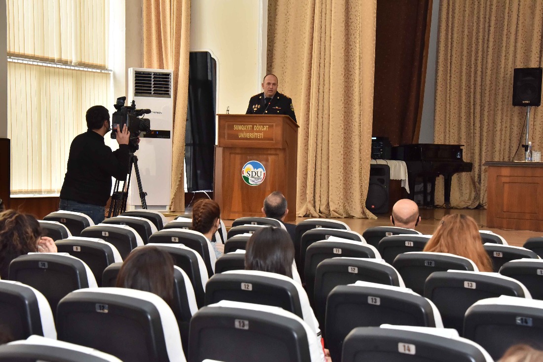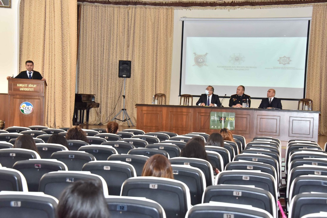 Noyabrın 16-da Sumqayıt Dövlət Universitetində karantin qaydalarına əməl olunmaqla "İnsan alverinə qarşı mübarizə” mövzusunda maarifləndirici tədbir keçirildi.