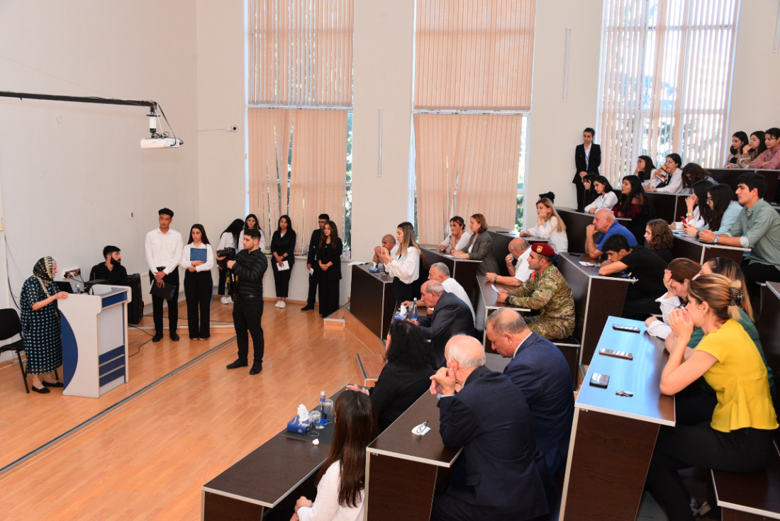 Tədbiri giriş sözü ilə fakültənin dekanı dosent Xalidə Həsənova açaraq qeyd etdi ki, hər birimiz müasir Azərbaycan tarixinin ən qürurlu, fəxarətli günlərini yaşayırıq. 27 sentyabr 2020-ci il tarixində Ermənistan silahlı qüvvələrinin Azərbaycana növbəti dəfə təxribatının qarşısını almaq məqsədilə Ali Baş Komandan cənab İlham Əliyevin başçılığı ilə müzəffər Ordumuzun əks hücum əməliyyatı nəticəsində uzun illər düşmən tapdağı altında olan torpaqlarımız yağı düşmən tapdağından azad edildi. 44 gün davam edən hərbi əməliyyatlar nəticəsində Azərbaycan Ordusu Ermənistanın silahlı qüvvələrini məhv edərək tariximizə yeni bir gün yazdı və şəhidlərimizin qisası alındı. Əlbəttə ki, bu 44 günün hər günü Azərbaycanın şanlı tarixidir.