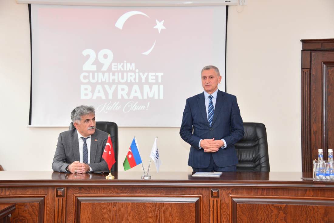 Əvvəlcə rektor professor Elxan Hüseynov dəyirmi masa ətrafında Türkiyənin Azərbaycandakı təhsil müşaviri Ali Rza Altunelin rəhbərliyi ilə nümayəndə heyətini qəbul etdi, onları salamladı və universitetdə görməkdən məmnunluğunu ifadə etdi. Türk xalqının istiqlal mübarizəsindən, Türkiyə Respublikasının bugünkü inkişaf və tərəqqisindən danışdı. Qeyd etdi ki, dövlət müstəqilliyi hər bir xalqın malik olduğu ən dəyərli sərvətdir. Türk xalqı 99 il bundan əvvəl dövlət müstəqilliyini elan etmişdir. Rektor qardaş ölkənin müstəqillik bayramı münasibətilə Türkiyə xalqını təbrik etdi və onlara inkişaf və tərəqqi arzuladı. Türkiyə və Azərbaycan xalqlarının hər zaman bir-birinin yanında olduğunu vurğuladı və İkinci Qarabağ müharibəsində göstərdikləri dəstək üçün Türkiyə xalqına təşəkkür etdi. Rektor bildirdi ki, Azərbaycan xalqı və dövləti qardaş dəstəyini minnətdarlıq hissi ilə çox yüksək qiymətləndirir.