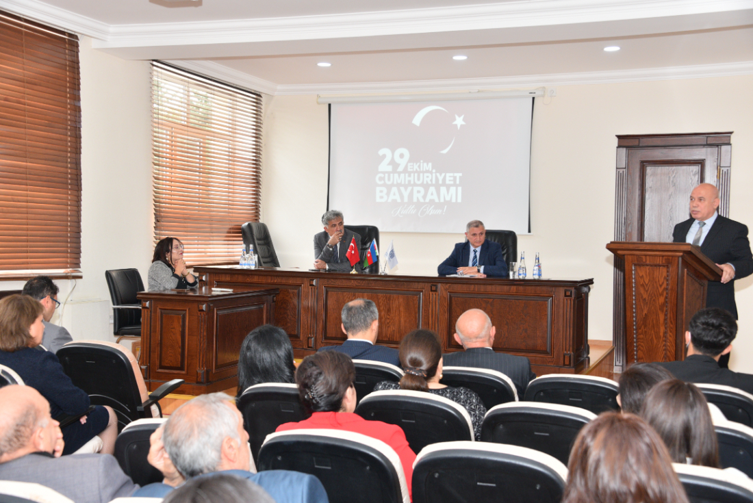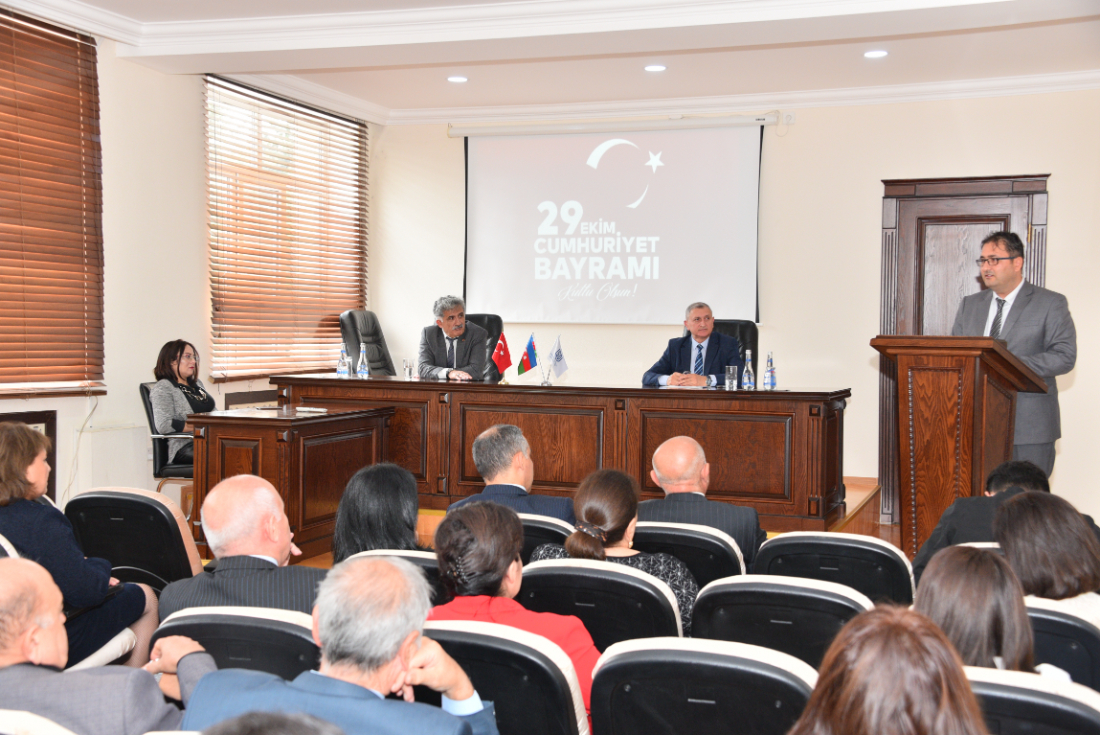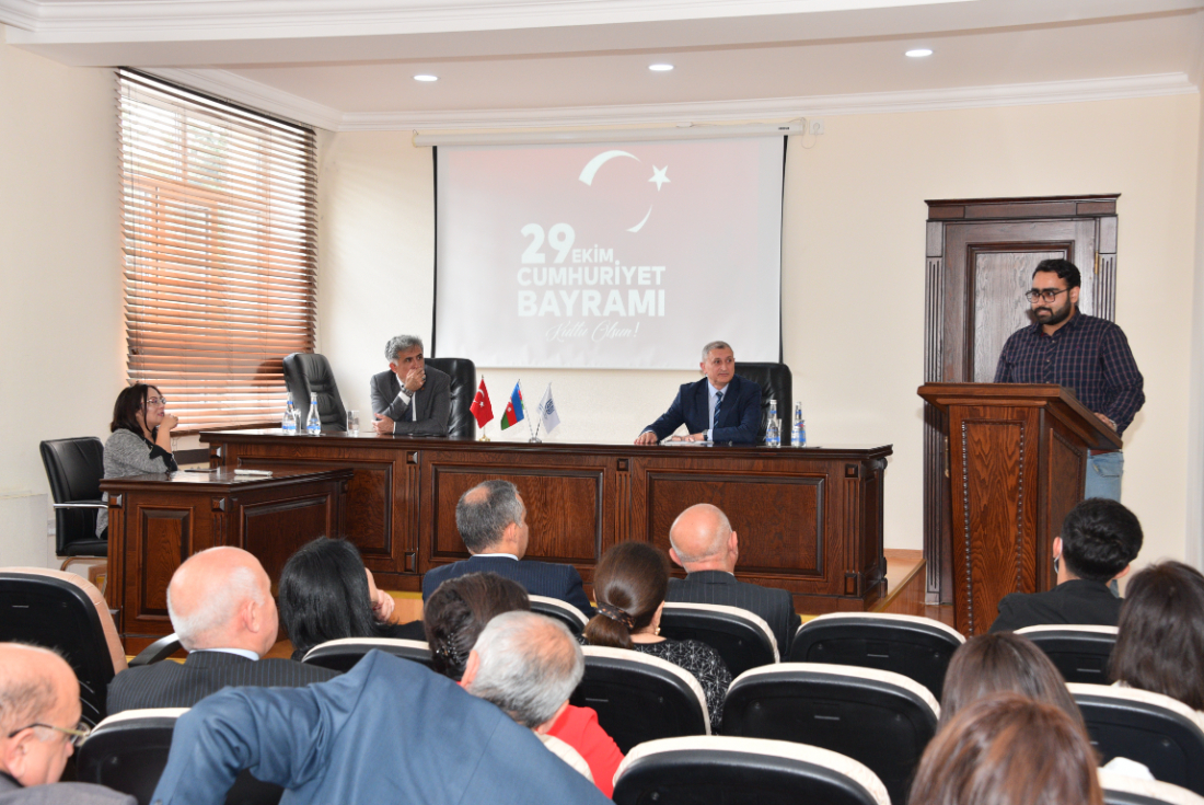 Filologiya fakültəsinin dekanı dosent Sevinc Həmzəyeva çıxış edərək Türkiyə xalqını cümhuriyyət bayramı münasibətilə təbrik etdi. Bildirdi ki, Azərbaycan‒Türkiyə dostluğu və qardaşlığı xalqlarımızın ortaq milli, mənəvi dəyərlərindən və ənənələrindən güc alır.