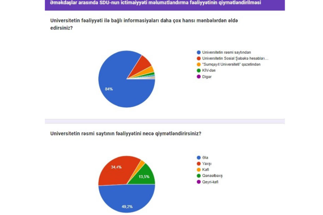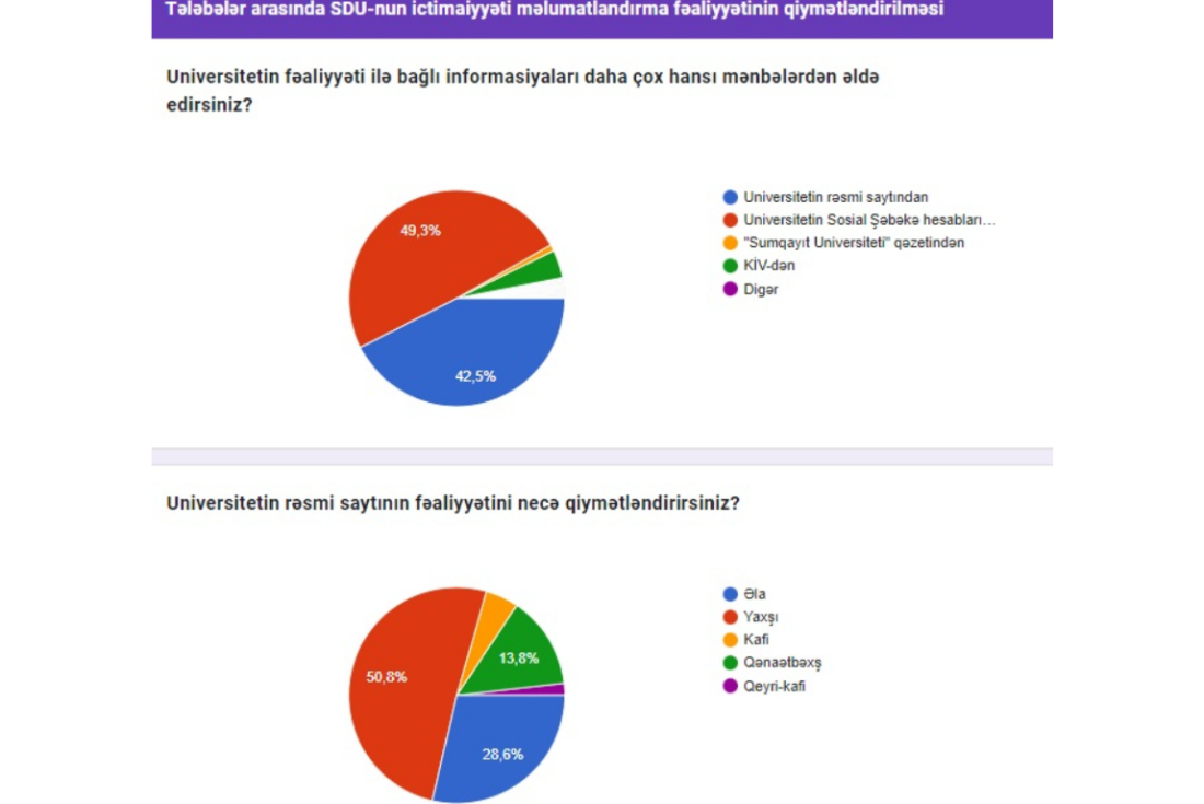 Sumqayıt Dövlət Universitetində dekabr ayının 19-dan 29-dək universitetin əməkdaşları və tələbələri arasında anonim və şəffaf şəkildə Sumqayıt Dövlət Universitetinin ictimaiyyəti məlumatlandırma fəaliyyətinin qiymətləndirilməsi ilə bağlı sorğu keçirilmişdir. Sorğunun keçirilməsində əsas məqsəd SDU-nun ictimaiyyəti məlumatlandırma fəaliyyətinin mütəmadi olaraq izlənilməsi, təhlili və təkmilləşdirilməsindən ibarətdir. Ümumilikdə sorğuda 1700 nəfər iştirak etmişdir. Nəticələrə əsasən universitetin fəaliyyəti ilə bağlı informasiyaları əməkdaşların 84%-i universitetin rəsmi saytından, tələbələrin 49,3%-i isə universitetin sosial şəbəkə hesablarından əldə edirlər. Əməkdaşların 49,2 %-i universitetin rəsmi saytının fəaliyyətini “əla”, tələbələrin isə 50,8%-i “yaxşı” qiymətləndirib. Əməkdaşların 49,2%-i, tələbələrin isə 49,4 %-i universitetin rəsmi sosial şəbəkə hesablarının fəaliyyətini “yaxşı” qiymətləndiriblər.
