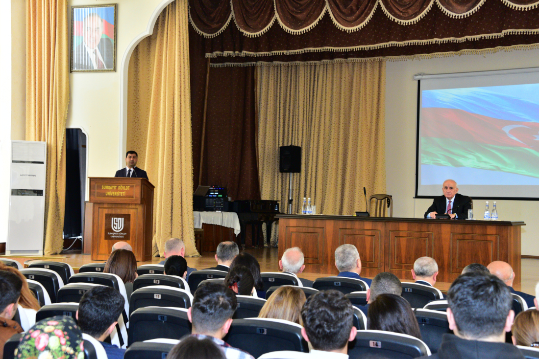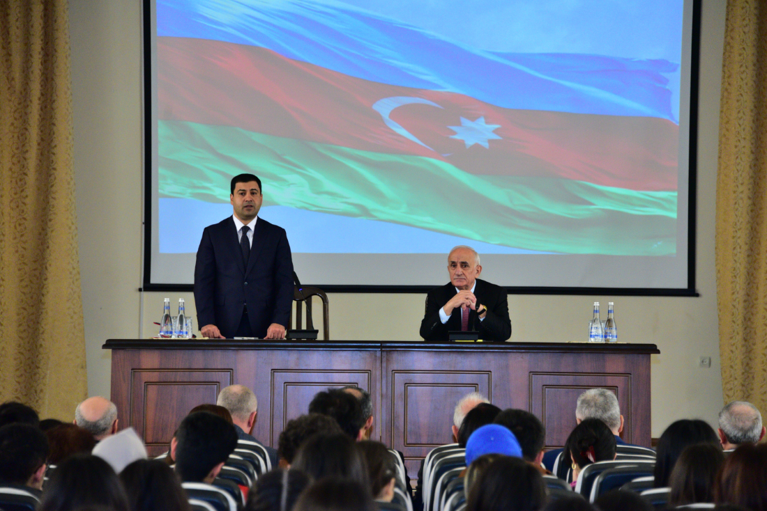 Universitetin professor-müəllim və tələbə heyətinin iştirak etdiyi tədbiri giriş sözü ilə rektor professor Elxan Hüseynov açaraq, tədbirin əhəmiyyətindən bəhs etdi. Bildirdi ki, Dövlət Təhlükəsizliyi Xidməti milli maraqlarımızın və təhlükəsizliyimizin etibarlı təminatı istiqamətində həyata keçirdiyi uğurlu fəaliyyəti ilə tarixin şərəfli səhifələrini yazır. Ölkəmizdə dövlət müstəqilliyi bərpa edildikdən sonra Azərbaycan Ermənistanın hərbi təcavüzü, separatizm və dövlətçiliyin itirilməsi təhlükəsi ilə, dərin siyasi-iqtisadi böhranla, qanunsuz silahlı dəstələrin və cinayətkar qrupların tüğyan etməsi ilə üzləşdi. Məhz belə bir şəraitdə Ülu Öndərimiz Heydər Əliyev xalqın təkidi ilə siyasi rəhbərliyə qayıtdı. Yalnız bundan sonra ölkə vətəndaş müharibəsindən xilas edildi, qanunçuluğun və ictimai-siyasi sabitliyin bərpasına nail olundu, demokratik, hüquqi dövlətin bünövrəsi qoyuldu.