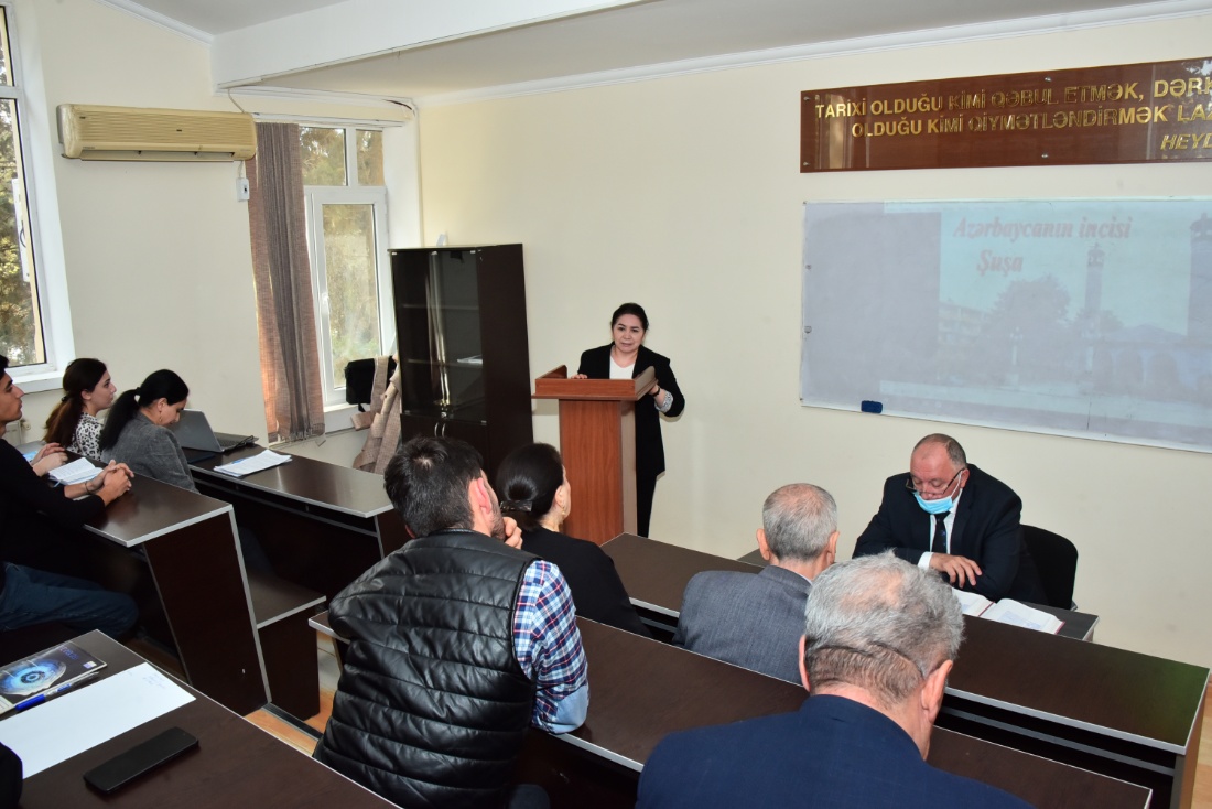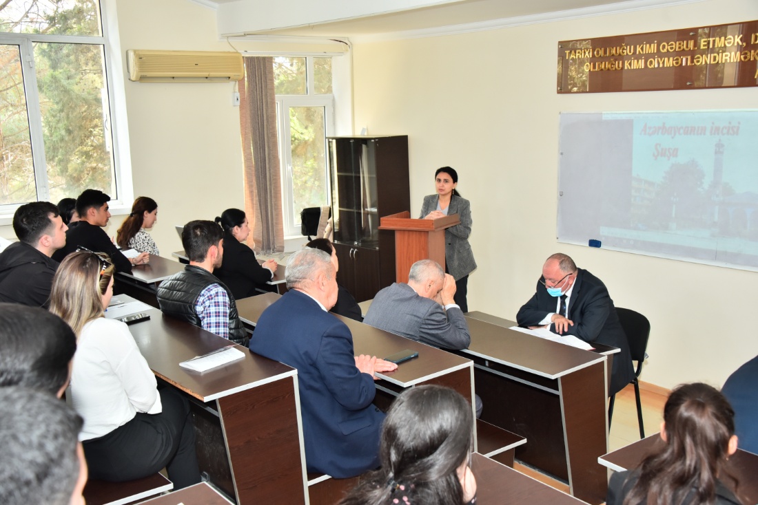 Tarix və onun tədrisi metodikası kafedrasının müdiri dosent Sona Məhərrəmova “Şuşa şəhərinin inkişafında Heydər Əliyevin rolu” mövzusunda çıxış edərək bildirdi ki, Ümummilli Lider Heydər Əliyev Sovet Azərbaycanına rəhbərlik etdiyi dövrdə Şuşa şəhərinin inkişafına xüsusi diqqət ayırmışdı. Məhz Ulu Öndər sayəsində Şuşa şəhərinin tarixi memarlıq abidələri qorunub-saxlanmış, ümumittifaq səviyyəli kurort-sanatoriya şəhərinə çevrilmiş, M.P.Vaqifin məqbərəsi, “Vaqif Poeziya Evi”, şairə Xurşidbanu Natəvanın abidəsinin açılışı olmuş, ermənilərin əsassız iddialarının qarşısı alınmışdır. Ulu Öndər Heydər Əliyev Şuşa haqqında deyirdi: Şuşa Azərbaycanın ən əziz və böyük tarixi olan bir guşəsidir. Şuşanı yaradanlar, Şuşa şəhərini quranlar, Şuşa qalasını tikənlər Azərbaycan torpağının sahibləri olublar və Qarabağda Azərbaycan torpağının daim qorunması, saxlanması üçün Şuşa şəhərini, qalasını yaradıblar. Bu, təkcə Azərbaycan xalqının, əcdadlarımızın yaratdığı böyük şəhər deyil, həm də böyük bir tarixi abidədir.