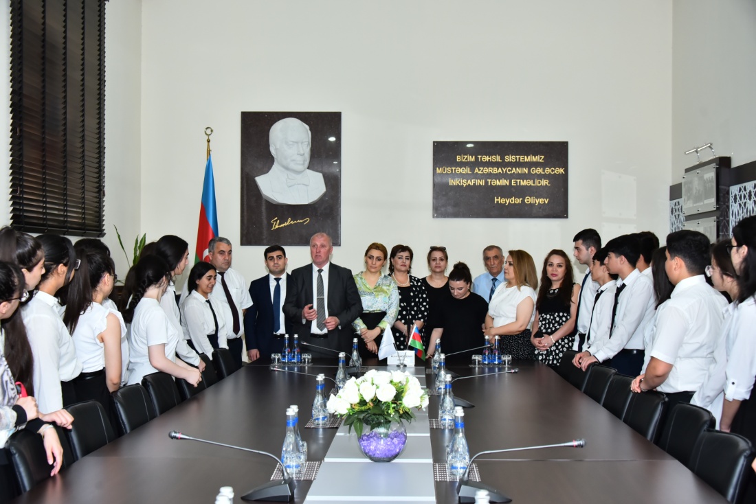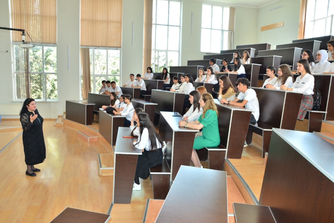Şagirdləri SDU-nun Sosial məsələlər və ictimaiyyətlə əlaqələr üzrə prorektoru dosent Elmar Xəlilov qəbul etdi. Bildirdi ki, şagirdlər arasında tanıtım məqsədi ilə təşkil olunmuş ekskursiya artıq ənənə halı alıb. Belə ekskursiyalar vasitəsilə şagirdlər ixtisas seçimini müəyyənləşdirir, gələcəkdə hansı təhsil müəssisəsinin tələbəsi adını qazanmaq qənaətinə gəlir, seçdikləri ixtisasların əmək bazarında yerini təyin edir.