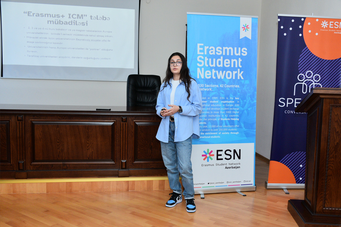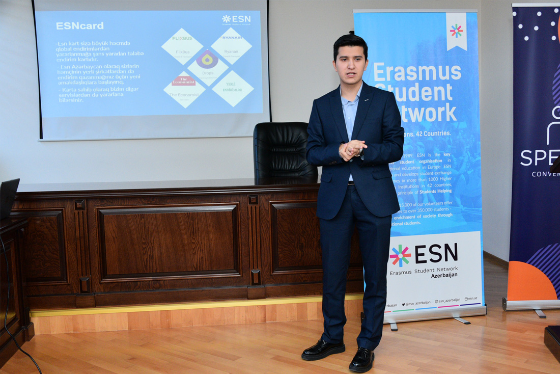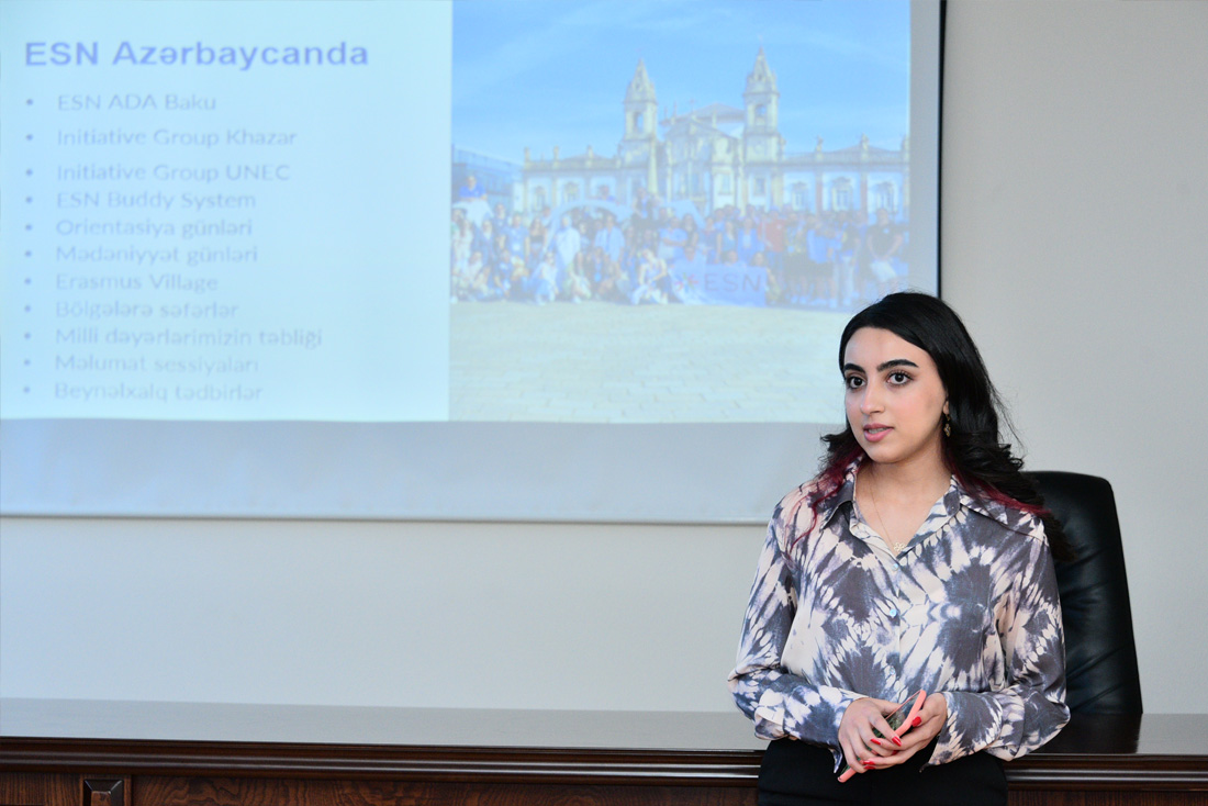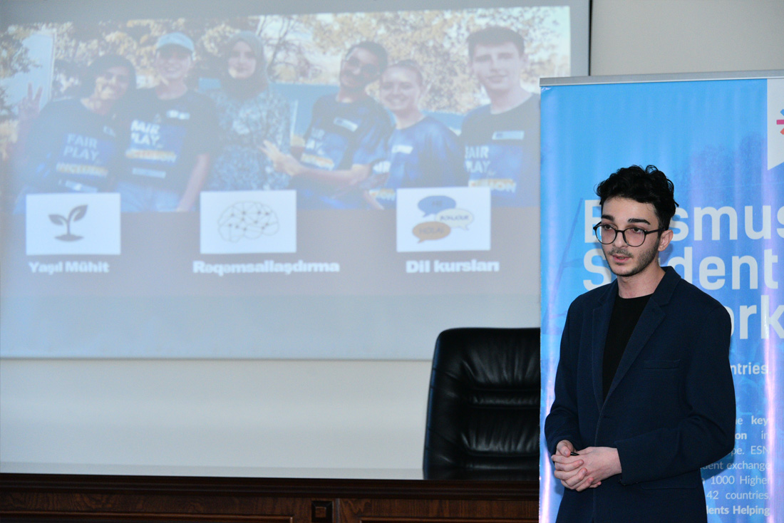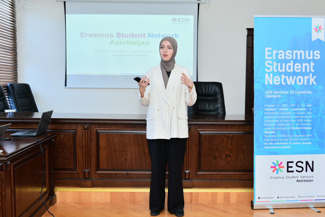 Mübadilə imkanları barədə təqdimatla çıxış edən ESN nümayəndəsi ESN Azərbaycanın fəaliyyət istiqamətləri, həyata keçirdiyi layihələr barədə də tələbələri məlumatlandırdı.