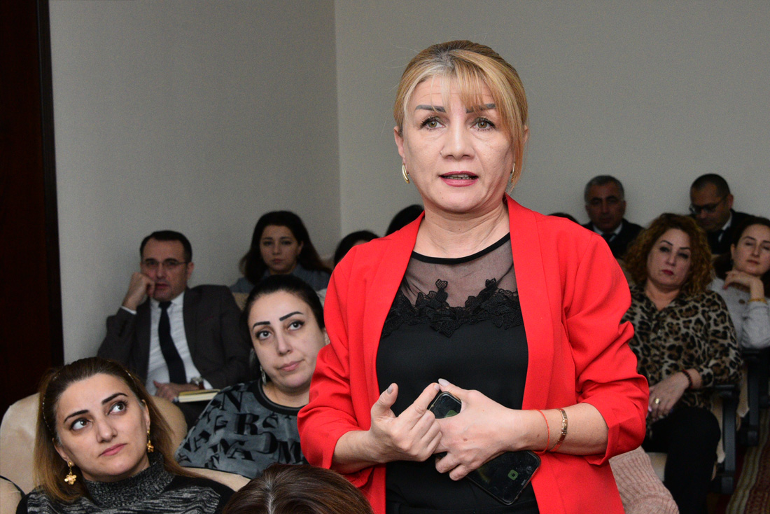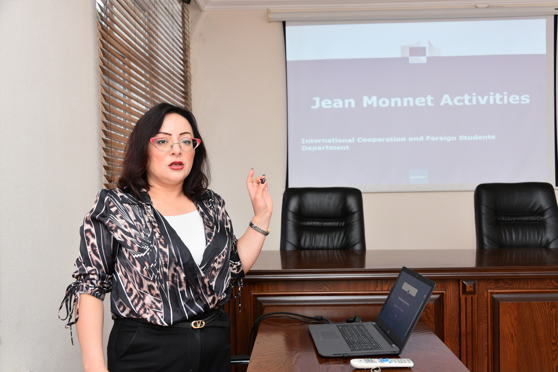 Təqdimatla çıxış edən Beynəlxalq əməkdaşlıq və əcnəbi tələbələr şöbəsinin müdiri Sədaqət Fətullayeva Jean Monnet Module, Jean Monnet Chair və Jean Monnet Centre of Excellence barədə ətraflı məlumat verdi. Prioritet sahələr və mövzular, layihə büdcəsi, maksimum maliyyələşmə məbləği, dünyada və Azərbaycanda qazanılmış layihələrin xüsusiyyətlərini vurğulayan Sədaqət Fətullayeva layihə qiymətləndirilməsinin meyarları, müəlliflərin Avropa İttifaqının portalında qeydiyyatdan keçirilməsi və layihələrin yüklənməsi detallarını qeyd etdi.