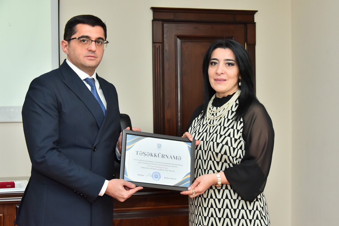 Rüfət Əzizov universitetin elmi-pedaqoji və ictimai həyatında fəal iştirakına görə dosent Mahal Muradova və dosent Sevinc Həmzəyevaya Təşəkkürnamə təqdim etdi, onlara sonrakı fəaliyyətlərində yeni yaradıcılıq uğurları arzuladı.