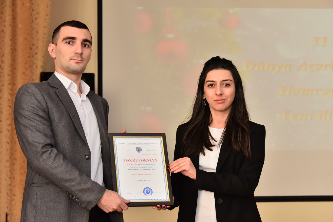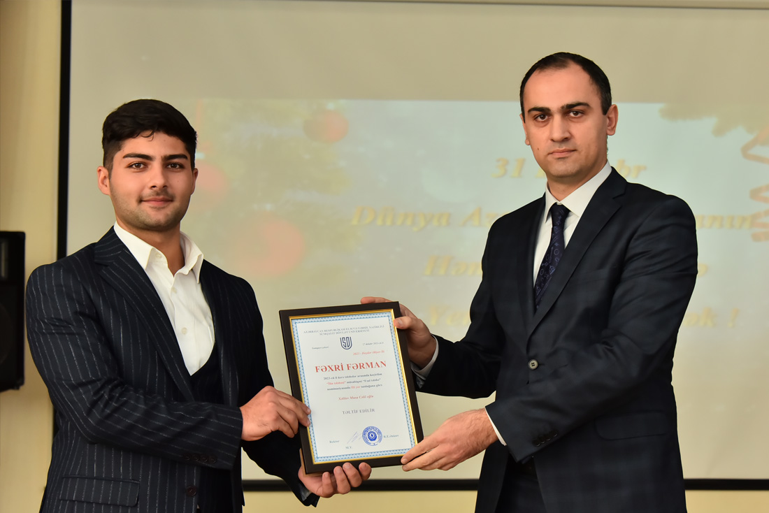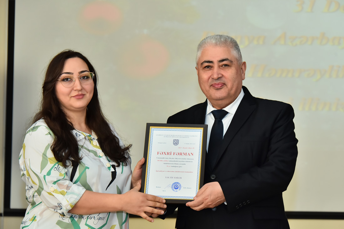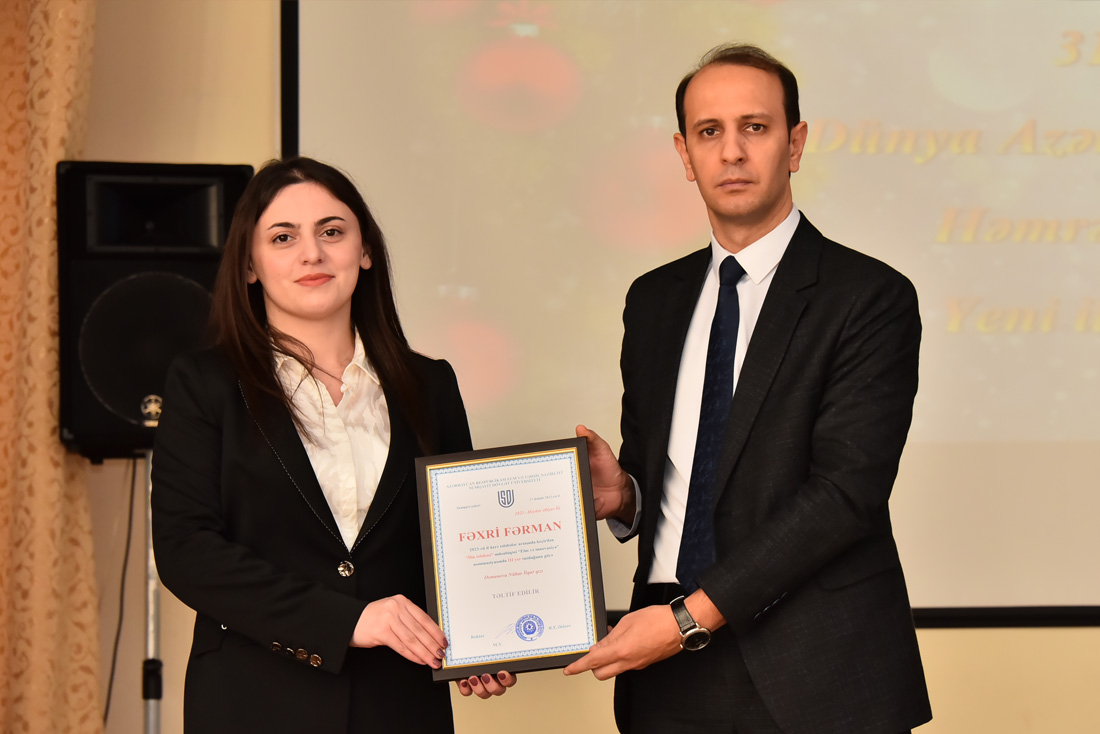 Sonra Ümummilli Lider Heydər Əliyevin 100 illik yubileyi, Zəfər Günü, Müstəqilliyin Bərpası Günü, “İlin tələbəsi” münasibətilə keçirilmiş müxtəlif yarış, müsabiqələrdə yer tutmuş qaliblərə Fəxri fərman və dəyərli hədiyyələr təqdim edildi.