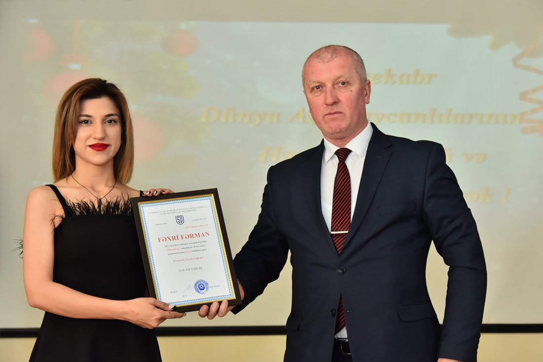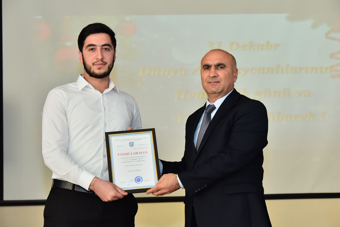 Universitetin rektoru Rüfət Əzizov tədbir iştirakçılarını salamlayaraq, Dünya Azərbaycanlıların Həmrəyliyi Günü və Yeni il münasibətilə kollektivi təbrik etdi, bu əlamətdar günün əhəmiyyətindən, dünya Azərbaycanlılarının birlik və həmrəyliyindən, o cümlədən ölkəmizin son illər ərzində əldə etdiyi uğurlardan söz açdı. Bildirdi ki, hər birimiz üçün əziz və doğma bayram olan Dünya Azərbaycanlılarının Həmrəylik Gününün əsası dünyanın müxtəlif ölkələrində yaşayan soydaşlarımızın birliyinin yaradılması məqsədilə Ümummilli Liderimiz Heydər Əliyev tərəfindən qoyulmuşdur. Artıq 34 ilə yaxındır ki, dünya azərbaycanlıları bu günü ümummilli birliyin, həmrəyliyin rəmzi kimi yüksək səviyyədə qeyd edirlər. Torpaqlarımızın işğaldan azad olunması milli həmrəyliyimizin təntənəsi, xalqımızın öz rəhbəri ətrafında sıx birləşməsinin təcəssümü oldu.