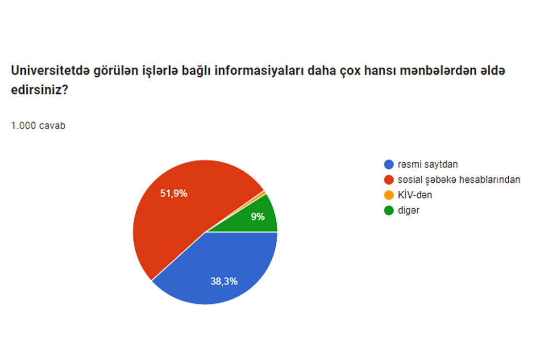 “Universitetdə görülən işlərlə bağlı informasiyaları daha çox hansı mənbələrdən əldə edirsiniz?” sorğusuna əsasən 38,3 % rəsmi saytdan, 51,9 % sosial media hesablarından, 0,8 % KİV-dən, 9 % isə digər vasitələrlə əldə etdiyini qeyd edib.