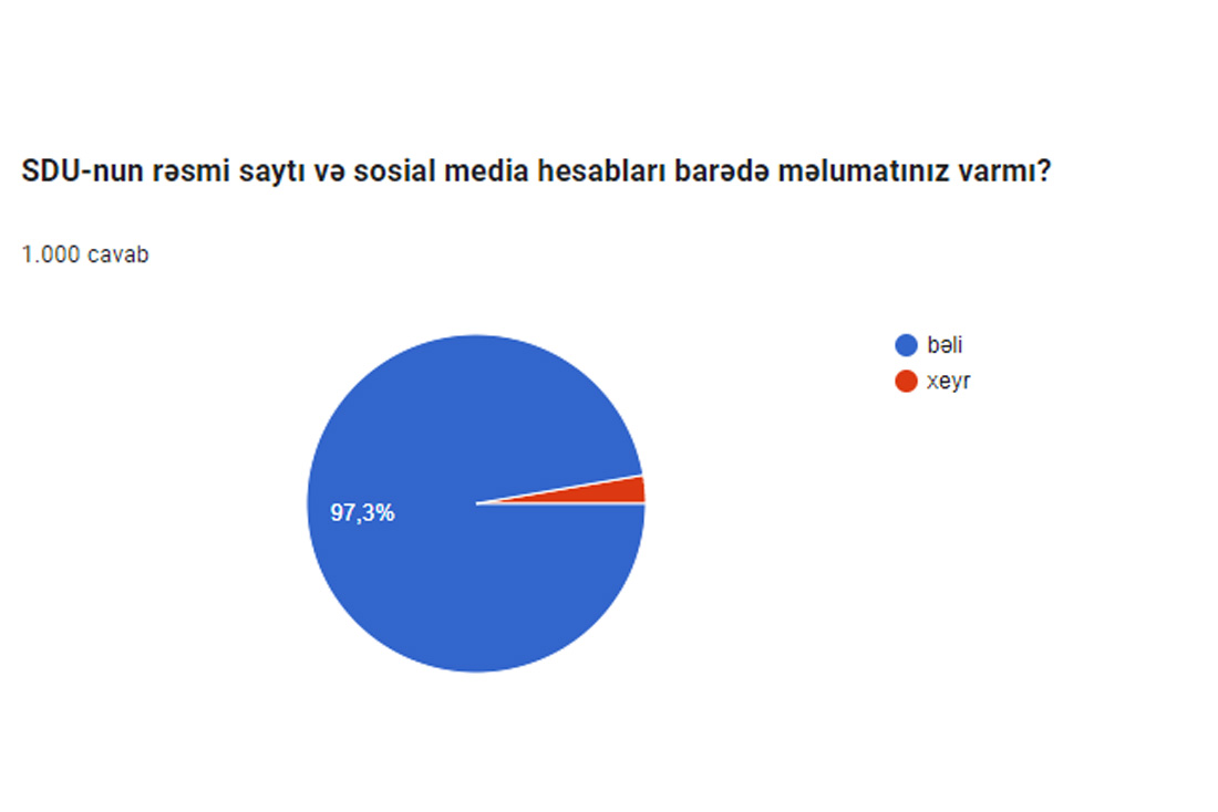 “SDU-nun rəsmi saytı və sosial media hesabları barədə məlumatınız varmı?” sorğusuna əsasən 97,3% bəli, 2,7 % xeyr cavabını qeyd etmişdir.