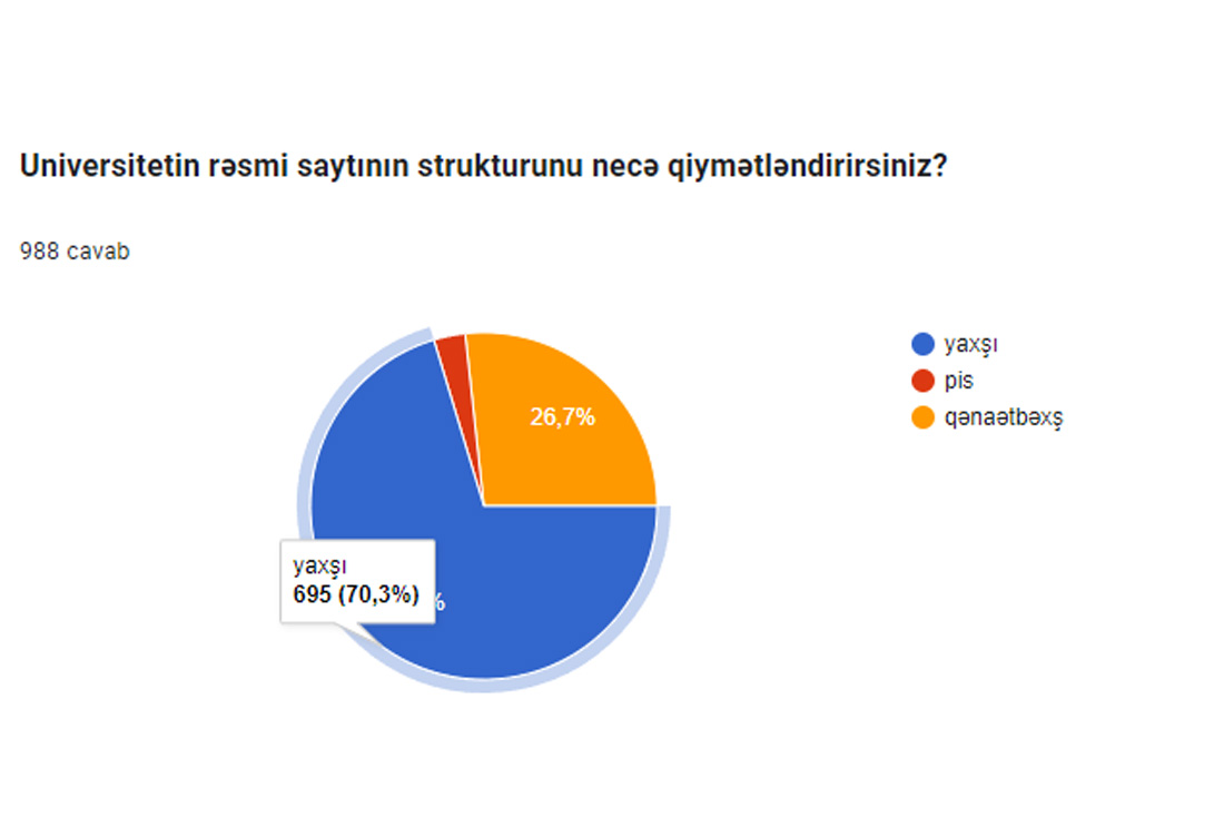 “Universitetin rəsmi saytının strukturunu necə qiymətləndirirsiniz?” sorğusuna əsasən 70,3% yaxşı, 26,75 qənaətbəxş, 2,9 % isə qaneedici hesab etmir.