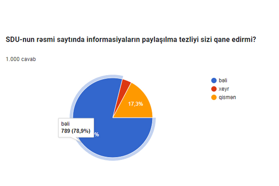 “SDU-nun rəsmi saytında informasiyaların paylaşılma tezliyi sizi qane edirmi?” sorğusuna əsasən 78,9% bəli, 17,3% qismən, 3,8% xeyr cavablarını qeyd edib.