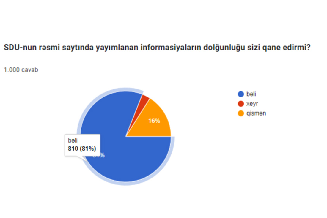 “SDU-nun rəsmi saytında yayımlanan informasiyaların dolğunluğu sizi qane edirmi?” sorğusuna əsasən 81% bəli, 16% qismən, 3% xeyr cavablarını qeyd edib.