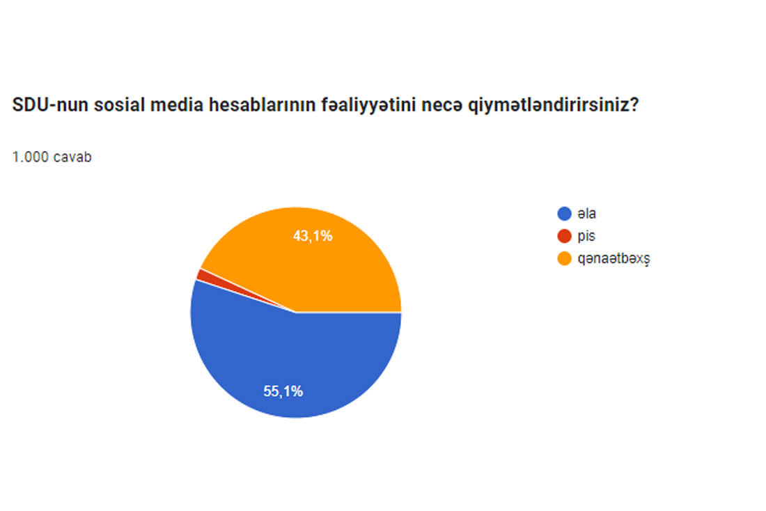 “SDU-nun sosial media hesablarının fəaliyyətini necə qiymətləndirirsiniz?” sorğusuna əsasən 55,1 % əla, 43,1 % qənaətbəxş, 1,8% qaneedici hesab etmir.