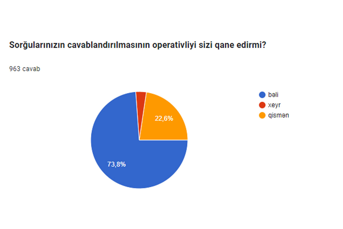 “Sorğularınızın cavablandırılmasının operativliyi sizi qane edirmi?” sorğusuna əsasən 73,8% yaxşı, 22,60% qismən, 3,5% qaneedici hesab etmir.