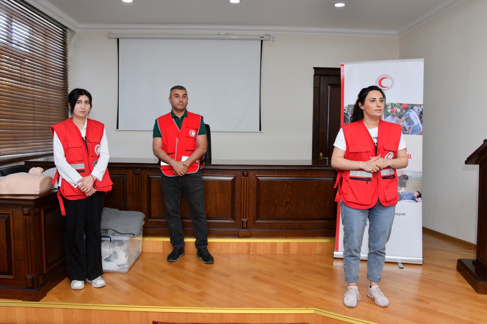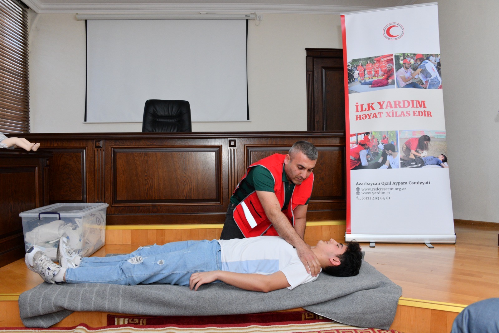 Sonra QAC-ın Sumqayıt şəhər bölməsinin əməkdaşları tələbələrə müxtəlif vəziyyətlər zamanı ilk tibbi yardımın göstərilməsi, müxtəlif travmalardan yaranan qanaxmalarda yardımın təşkili, süni tənəffüsün verilməsi və digər proseslər haqqında məlumat verdilər.
