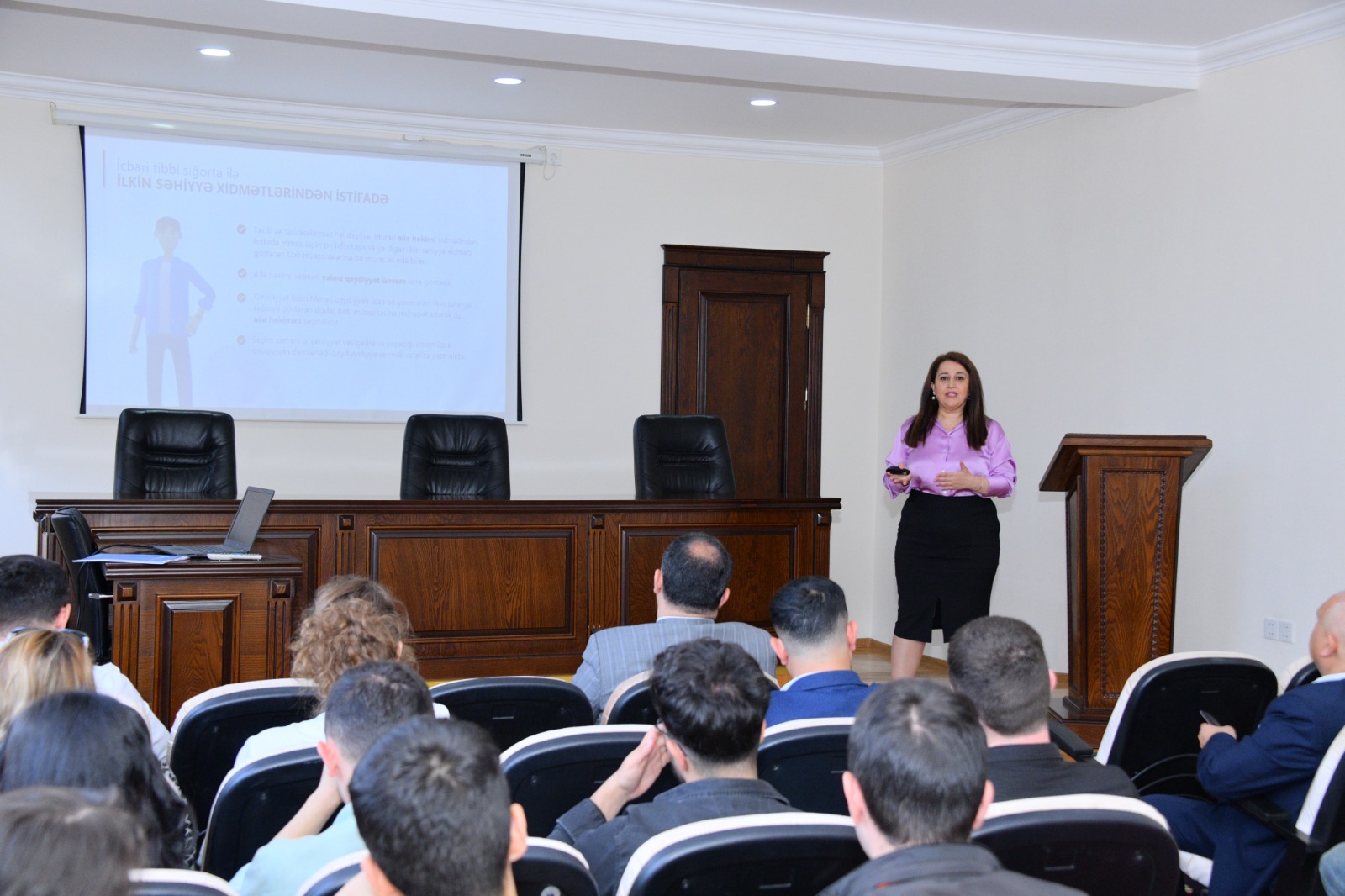 Sonra İcbari Tibbi Sığorta üzrə Dövlət Agentliyinin Marketinq və ictimaiyyətlə əlaqələr departamentinin aparıcı məsləhətçiləri Sevil Əliyeva və Emil Lətifov təqdimatla çıxış edərək icbari tibbi sığorta sisteminin mahiyyəti, onun əhalinin sosial müdafiəsinin gücləndirilməsindəki rolu, icbari tibbi sığorta sisteminin məqsədi, sistemdən istifadə qaydaları, müraciət formaları, “Xidmətlər Zərfi”nə daxil olan tibbi xidmətlər, eləcə də bu xidmətlərin həyata keçirildiyi tibb müəssisələri və s. haqda məlumat verdilər.