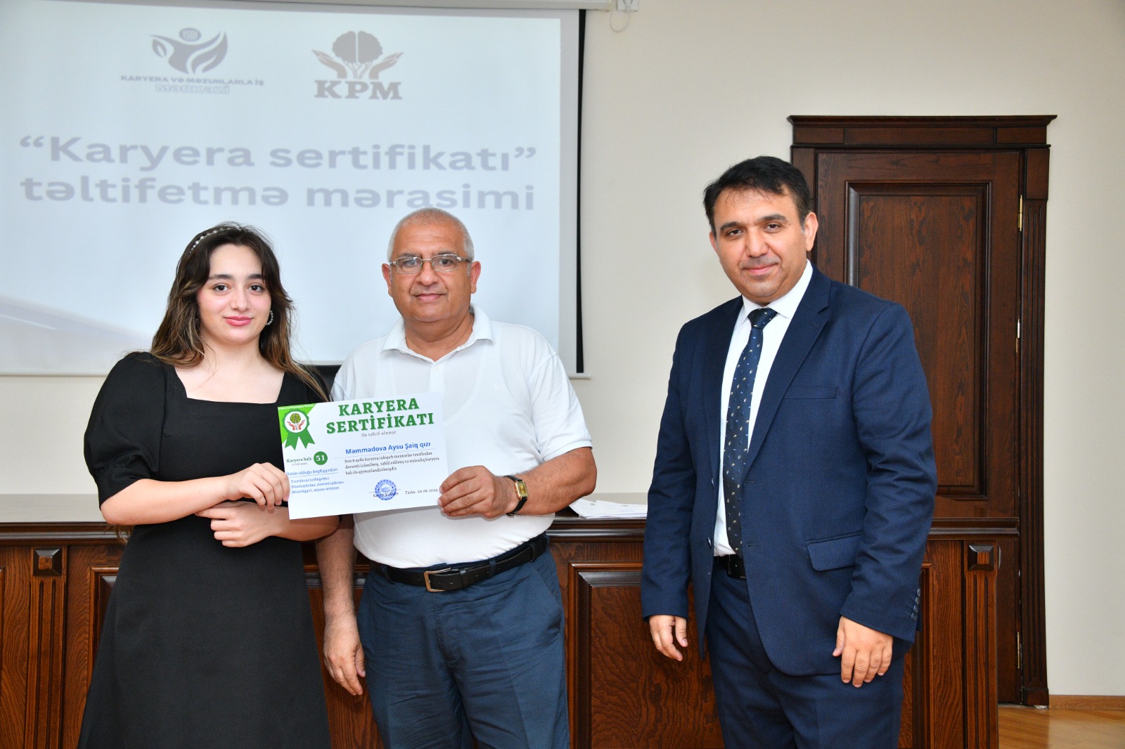 Sumqayıt Dövlət Universitetinin və universitetin nəzdində Sumqayıt Dövlət Texniki Kollecinin bir qrup tələbəsi Karyera və Psixologiya Mərkəzində “İSİM layihəsi” çərçivəsində təcrübə proqramını uğurla bitirərək, Mərkəz tərəfindən “Karyera sertifikatı” na layiq görülüblər. Bu münasibətlə iyunun 21-də Sumqayıt Dövlət Universitetində Karyera və Psixologiya Mərkəzinin rəhbəri Samir Vəliyevin, universitetin Karyera və məzunlarla iş mərkəzinin direktoru Nəsibə Əmirbəyovanın, fakültə dekanlarının və tələbələrin iştirakı ilə təltifetmə mərasimi keçirildi.
