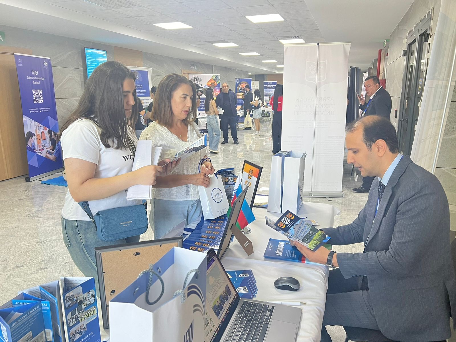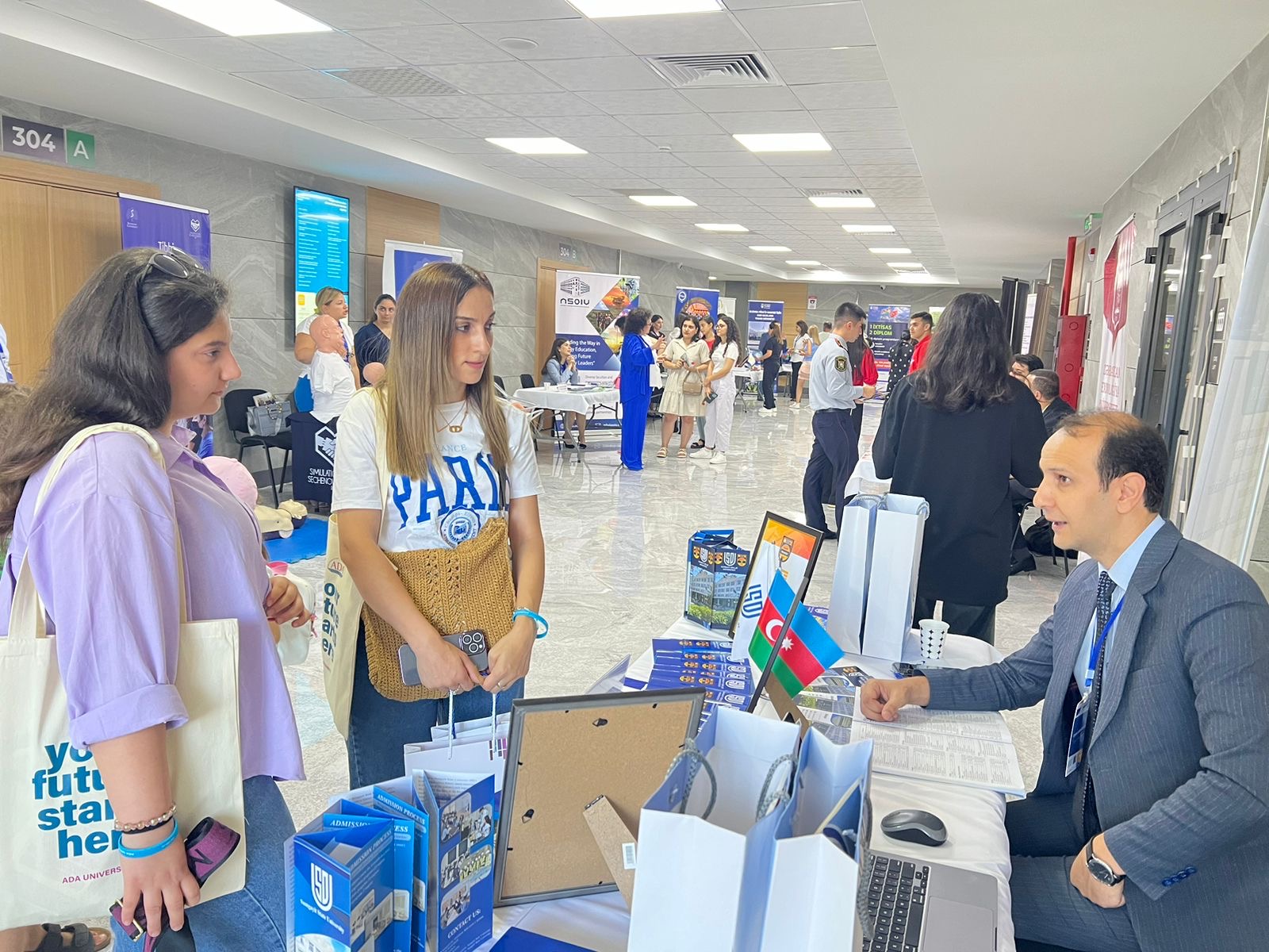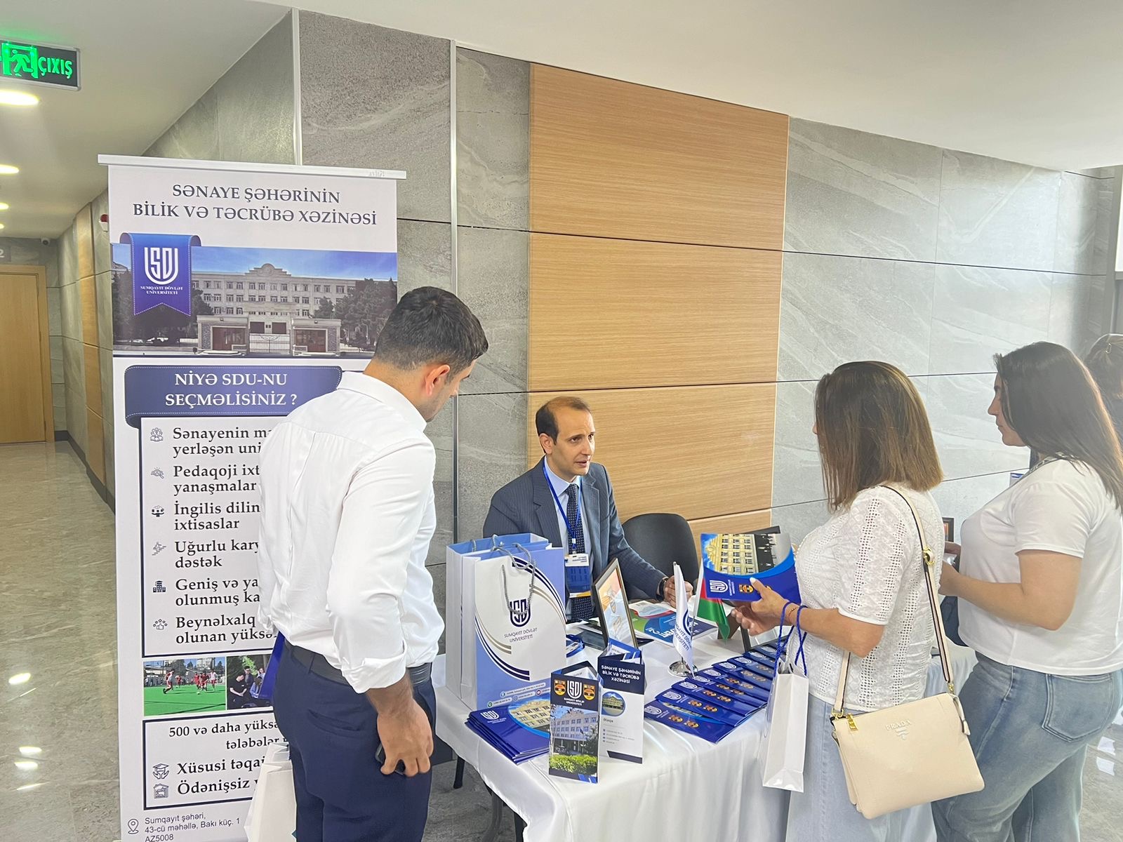 Sərgi ziyarətçiləri SDU-nun stendinə yaxınlaşaraq, universitetin təqdim etdiyi ixtisaslar, tədris proqramları, maddi-texniki baza, təhsil haqqı, güzəştlər, təqaüd proqramları və digər imkanlar barədə ətraflı məlumat əldə ediblər.