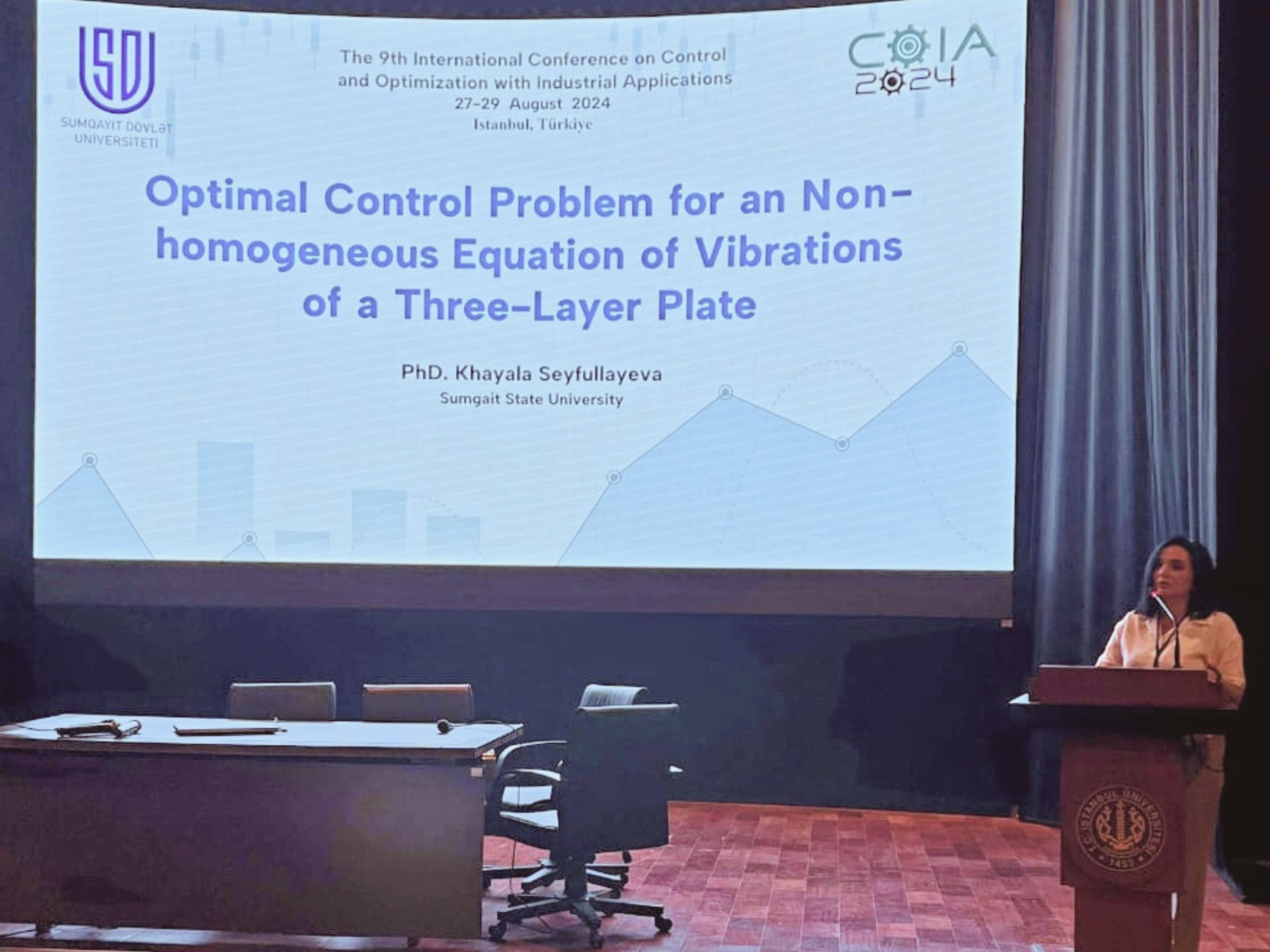 Sumqayıt Dövlət Universitetinin Riyaziyyat fakültəsinin dosenti Xəyalə Seyfullayeva 27-29 avqust 2024-cü il tarixlərində Türkiyənin İstanbul Cerrahpaşa Universitetində “Sənaye, tətbiqli idarəetmə və optimallaşdırma” (The 9th International Conference on Control and Optimization with Industrial Applications) mövzusunda 9-cu beynəlxalq elmi konfransda (COIA-2024) təqdimatla çıxış edib.