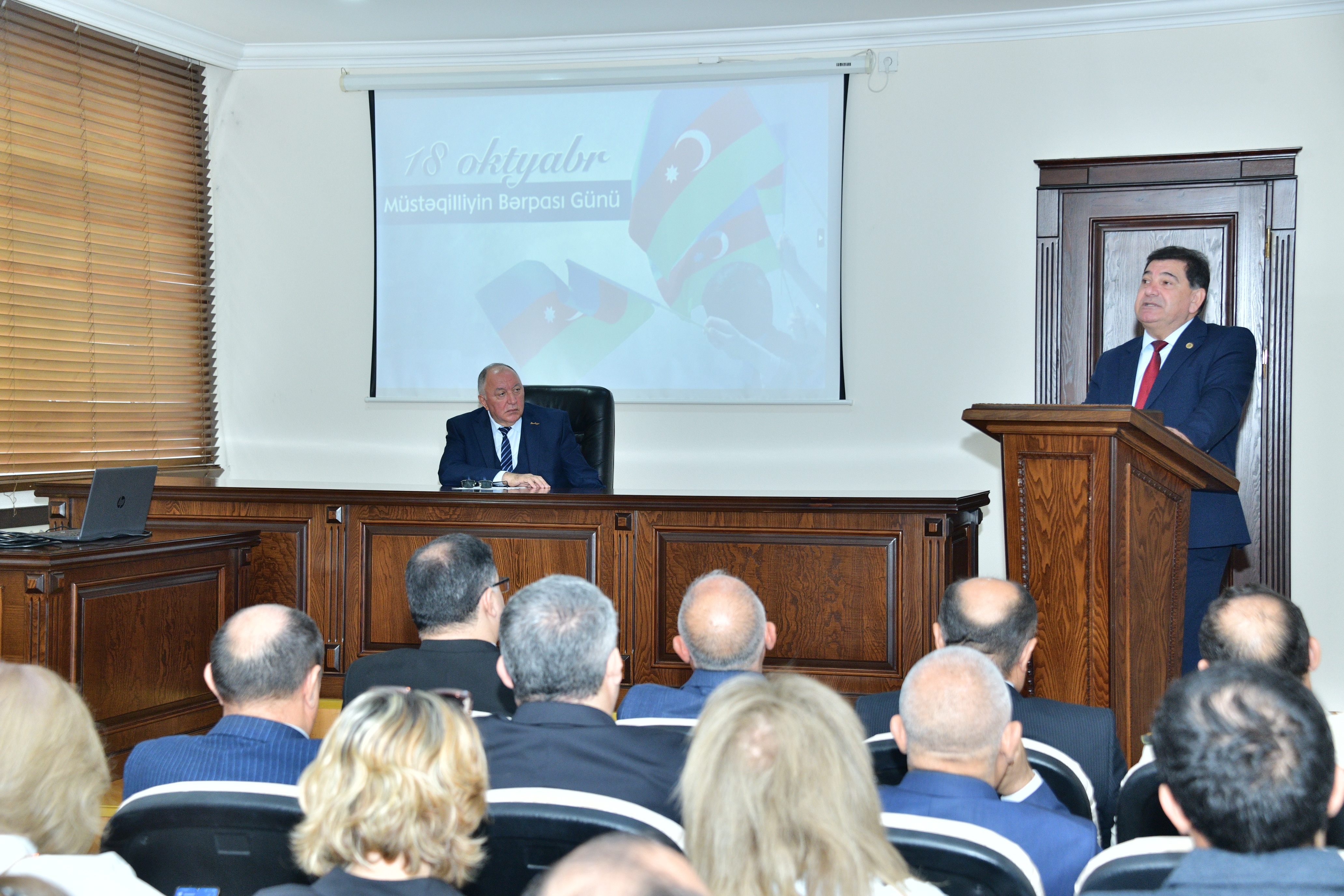 Oktyabrın 18-də Sumqayıt Dövlət Universitetində Tarix və coğrafiya fakültəsinin və Həmkarlar İttifaqı Komitəsinin birgə təşkilatçılığı ilə Azərbaycan Respublikasının Dövlət Müstəqilliyinin Bərpası Günü münasibətilə elmi-nəzəri konfrans keçirildi.Əvvəlcə ərazi bütövlüyümüz, müstəqilliyimiz uğrunda canlarından keçən şəhidlərimizin əziz xatirəsi bir dəqiqəlik sükutla yad edildi. Konfransı giriş sözü Tarix və coğrafiya fakültəsinin dekanı professor Adil Baxşəliyev açaraq Azərbaycan dövlət müstəqilliyinin bərpasının tarixi əhəmiyyətindən danışdı. 1918-ci ildə öz dövlət müstəqilliyini elan edən Azərbaycan Respublikasının 1991-ci il oktyabrın 18-də imzalanan konstitusiya aktı ilə özünün müstəqilliyini yenidən bərpa etdiyini bildirən dekan onu da vurğuladı ki, XX əsrdə iki dəfə müstəqilliyini elan edən xalqımız onu əldə etmək qədər qoruyub saxlamaq üçün də çətin sınaqlardan keçdi. Ona görə də müstəqilliyi qoruyub saxlamaq onu qazanmaqdan daha çətindir. Azərbaycan xalqı 1990-cı illərin əvvəllərində yenicə bərpa etdiyi müstəqilliyini itirmək təhlükəsi ilə üz-üzə qalmışdı. 1993-cü ildə xalqın təkidli tələbi ilə Azərbaycanda siyasi hakimiyyətə qayıdan Ulu Öndər Heydər Əliyev ölkəmizin müstəqilliyini əbədi və dönməz etdi. Ulu Öndər Heydər Əliyevin müstəqilliyimizin qorunub saxlanılması və möhkəmləndirilməsi istiqamətində yorulmaz fəaliyyəti bu gün onun layiqli davamçısı Prezident İlham Əliyev tərəfindən davam etdirilir. Azərbaycan əsl müstəqilliyə 30 il davam edən gərgin mübarizədən sonra Şanlı Zəfərə nail oldu. Bununla da Azərbaycanın ərazi bütövlüyü və tarixi ədalət bərpa olundu. Tədbirdə müstəqillik tariximizdən bəhs edən videoçarx nümayiş olundu. Sonra Azərbaycan və Şərqi Avropa xalqları tarixi kafedrasının dosenti Əmirxan İsayev “Azərbaycanın dövlət müstəqilliyi əbədidir” adlı məruzə ilə çıxış etdi. Məruzə ətrafında Tarix, coğrafiya və metodika kafedrasının müdiri dosent Sona Məhərrəmova “15 iyun 1993-cü il - Heydər Əliyevin hakimiyyətə qayıdışı və Azərbaycanın dövlət müstəqilliyinin möhkəmləndirilməsi”, Azərbaycan və Şərqi Avropa xalqları tarixi kafedrasının baş müəllimi Pərviz Cəfərov “Müstəqilliyimizin İlham Əliyev mərhələsi” mövzularında çıxış edərək 18 Oktyabr tarixinin Azərbaycanın ən şanlı səhifələrindən biri olduğunu, XX əsrin sonlarında SSRİ-nin dağılması ilə yaranan tarixi şərait nəticəsində Azərbaycanın öz müstəqilliyini bərpa etdiyini diqqətə çatdırdılar. Qeyd etdilər ki, əgər Azərbaycanın müstəqilliyi tarixi zərurətdən irəli gələn hadisə idisə, bu müstəqilliyin əbədiliyi və dönməzliyi Ümummilli Liderin adı ilə bağlıdır. Bu gün böyük şəxsiyyətin siyasi xəttini uğurla davam etdirən ölkə Prezidenti cənab İlham Əliyevin rəhbərliyi ilə dövlət müstəqilliyimiz daha da möhkəmləndi, ölkəmiz siyasi, iqtisadi cəhətdən dünyanın qüdrətli dövlətlərindən birinə çevrildi. Möhtəşəm uğurlara imza atan, tarixi Zəfər qazanan xalqımız bütün dünyaya göstərdi ki, Azərbaycanın müstəqilliyi əbədidir, dönməzdir!