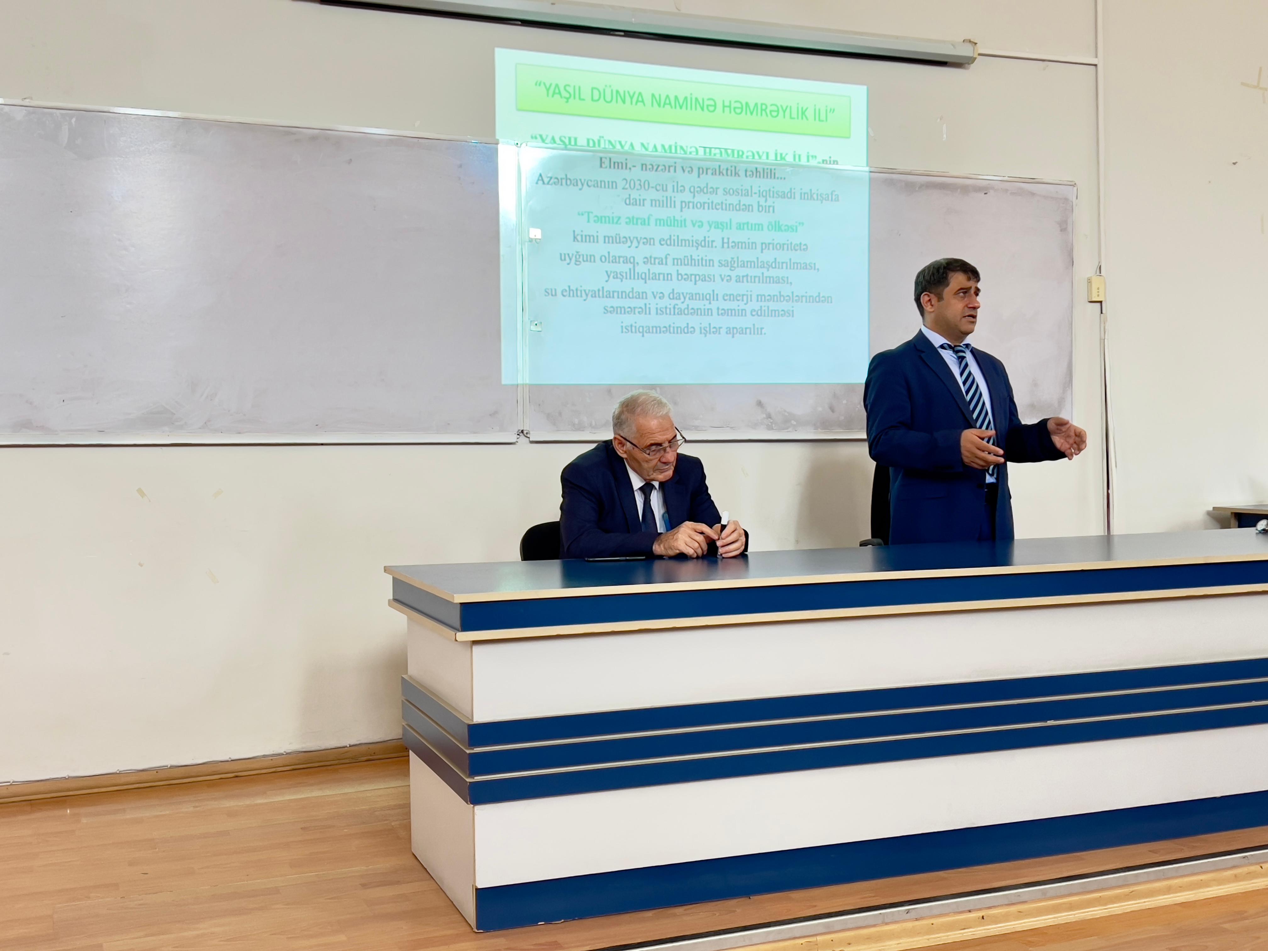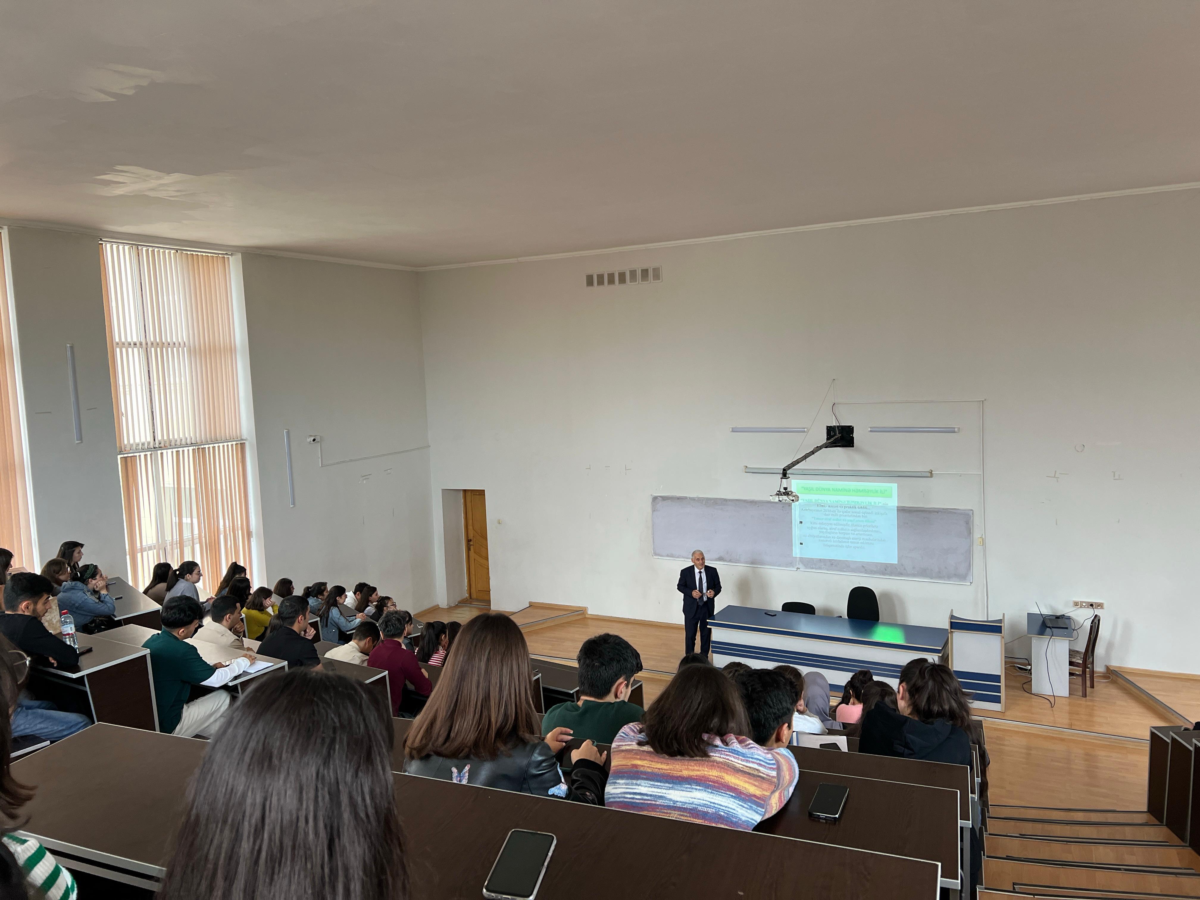 Sumqayıt Dövlət Universitetinin Təbiət elmləri fakültəsinin təşkilatçılığı ilə “Yaşıl Dünya Naminə Həmrəy olaq!” adlı tədbir keçirildi. Tədbiri fakültənin dekanı dosent Rəşad Səlimov açaraq BMT-nin Dayanıqlı İnkişaf Məqsədləri və COP29 konfransı haqqında ətraflı məlumat verdi. O, bu konfransın həm ölkəmiz, həm də dünya üçün böyük əhəmiyyətini vurğulayaraq, iqlim dəyişikliyi və ekoloji problemlərə qarşı birgə mübarizənin vacibliyini qeyd etdi. Rəşad Səlimov çıxışında COP29-un məqsədlərini və gözlənilən nəticələrini şərh edərək, tələbə və müəllimləri bu mövzuda fəal iştiraka səslədi. O, iqlim dəyişikliyinin təsirlərinin azaldılması üçün beynəlxalq səylərin önəmini vurğuladı və bu istiqamətdə həmrəylik və əməkdaşlığın zəruriliyini bir daha qeyd etdi.  Tədbirin növbəti hissəsində Biologiya kafedrasının dosenti Xanəhməd Həsənov “Yer planetində canlı aləmin mövcudluğu və həyatın mənşəyi” mövzusunda çıxış etdi. O, planetimizdəki canlıların müxtəlifliyi, ekosistemlərin tarazlığı və bioloji müxtəlifliyin qorunmasının əhəmiyyətini diqqətə çatdırdı. Xanəhməd Həsənov həyatın yaranma prosesi, canlıların inkişafı və onların ekosistemlərdəki roluna dair maraqlı elmi faktları iştirakçılarla bölüşdü. Tədbirin sonunda iştirakçılar məruzələrə dair suallar verərək müzakirələr apardılar. İqlim dəyişikliyi, biomüxtəlifliyin qorunması üçün atılmalı olan addımlar və gənc nəslin bu sahədəki fəallığı tədbirin əsas müzakirə mövzularını təşkil etdi. Tədbir, iştirakçıların aktiv iştirakı sayəsində daha da zənginləşdi və iqlim dəyişikliyi ilə mübarizədə birgə fəaliyyətin vacibliyi bir daha vurğulandı.Qeyd edək ki, bu kimi tədbirlər, ekoloji maarifləndirmənin artırılması, ekoloji şüurun formalaşdırılması və cəmiyyətin üzvləri olan tələbələrin bu məsələlərə daha həssas yanaşmasına mühüm töhfə verir.