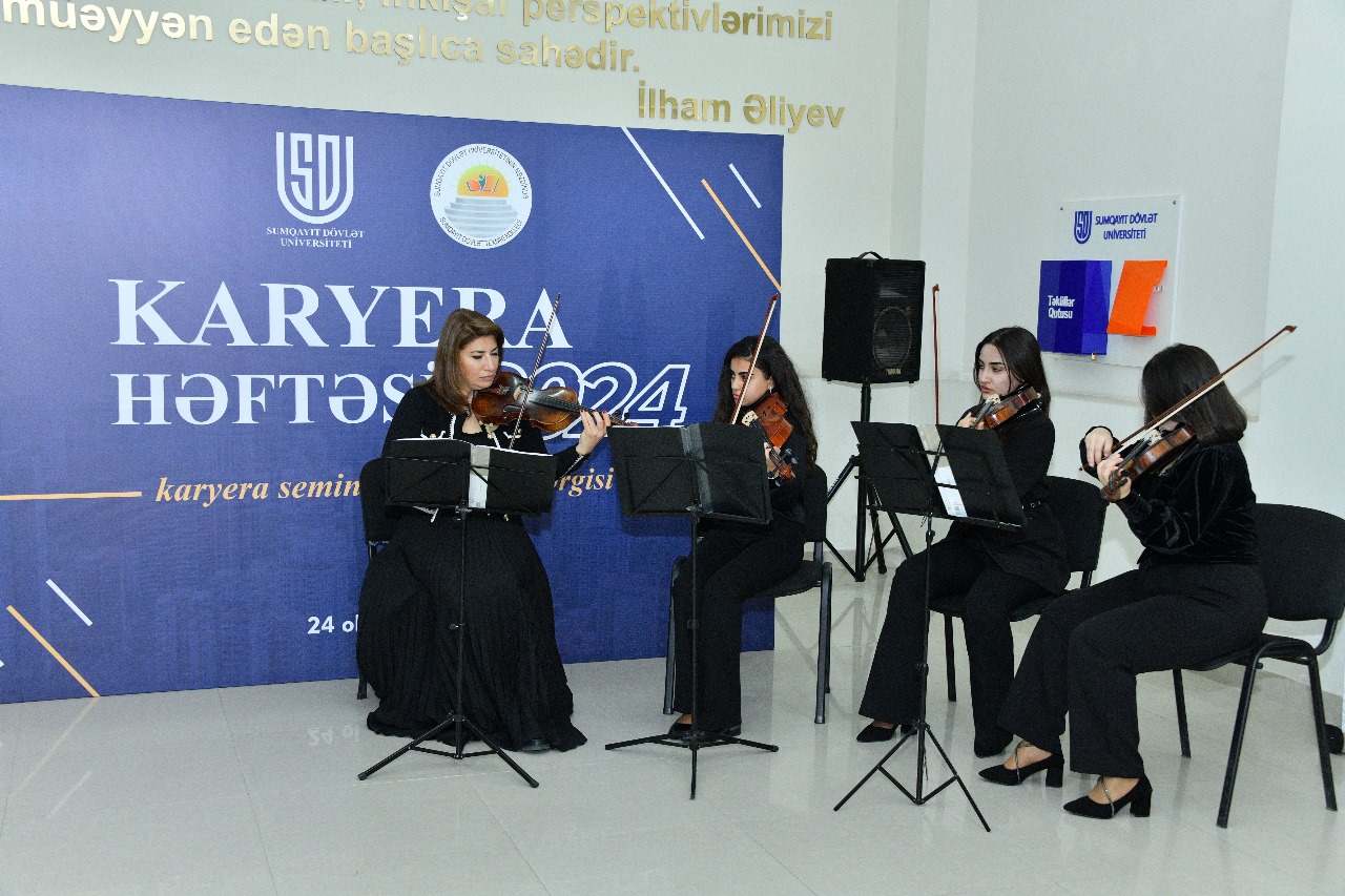 Oktyabrın 24-də Sumqayıt Dövlət Universitetinin və Sumqayıt Dövlət Texniki Kollecinin təşkilatçılığı ilə “Karyera Həftəsi” keçirildi. Tədbirdə müəssisə, idarə və təşkilatların nümayəndələri, eləcə də universitetin professor-müəllim və tələbə heyəti iştirak etdilər. Tədbiri universitetin Elm və innovasiyalar üzrə prorektoru Elşad Abdullayev açaraq "Karyera Həftəsi"nin məqsəd və əhəmiyyətindən bəhs etdi. O, son illər ölkəmizdə əmək bazarının inkişafı və gənclərin məşğulluğunun təminatı istiqamətində həyata keçirilən uğurlu dövlət layihələrinə diqqət çəkərək, bu tədbirin əsas məqsədinin tələbə və məzunları ölkənin əmək bazarı və mövcud karyera imkanları ilə tanış etmək olduğunu vurğuladı. Sumqayıt Dövlət Texniki Kollecinin direktoru Mətanət Pirquliyeva çıxışında tədbirin istehsalat təcrübəsi keçəcək tələbələr üçün əhəmiyyətini vurğuladı. Eləcə də, bu cür tədbirlərin gənclərin peşəkar bilik və bacarıqlarını artırmaqda, gələcək karyeralarına hazırlıq prosesində mühüm rol oynadığını qeyd etdi. Kaspi Təhsil Şirkətinin Sumqayıt filialının direktoru Vasif Əliyev tədbirin təşkilinə görə təşkilatçılara təşəkkür edərək, son dövrlərdə Sumqayıt Dövlət Universitetinin tələbə və məzunlarının məşğulluq səviyyəsini artırmaq məqsədilə ölkədə fəaliyyət göstərən dövlət və özəl müəssisələrlə əməkdaşlığını genişləndirdiyini vurğuladı. Eyni zamanda, universitetin tələbə və məzunlarının işlə təmin olunması və ixtisasları üzrə təcrübə keçmələri istiqamətində ciddi addımlar atıldığını izlədiyini qeyd etdi. “ATS Food” MMC-nin İnsan Resursları və inzibati işlər üzrə departamentinin direktoru Rafiq Süleymanov çıxış edərək təmsil etdiyi şirkətin SDU ilə birgə həyata keçirəcəkləri təlim və təcrübə proqramlarının uğurlu olacağına əminliyini bildirdi. Azərbaycan Milli Konservatoriy asının nəzdində Sumqayıt Musiqi Kollecinin tələbələrindən ibarət simli kvartet bədii rəhbər Könül Bəkirovanın müşayiəti ilə Azərbaycan və xarici bəstəkarların klassik, müasir əsərlərindən ibarət musiqi nömrələri ilə davam edən sərgidə 30-dan artıq şirkət öz vakansiyaları və təcrübə proqramları ilə iştirak etdilər.
