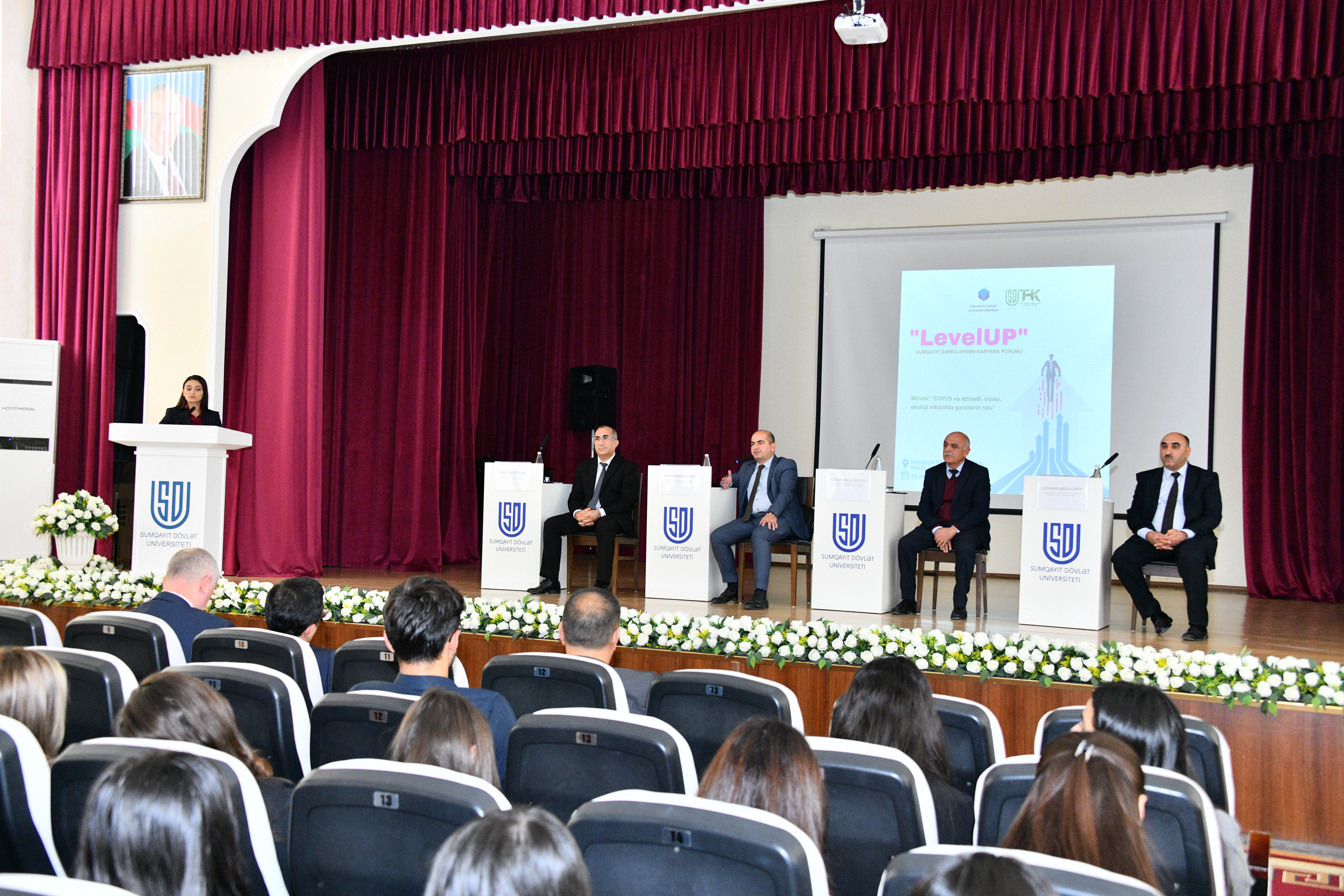 Oktyabrın 25-də Sumqayıt Dövlət Universitetində (SDU) SDU Tələbə Həmkarlar İttifaqı Komitəsi və Gənclərin İnkişaf və Karyera Mərkəzinin Abşeron-Xızı Regional nümayəndəliyinin birgə təşkilatçılığı ilə “COP29 və iqtisadi, siyasi, ekoloji inkişafda gənclərin rolu” mövzusunda forum keçirildi.Tədbir Azərbaycan Respublikasının Dövlət Himninin səsləndirilməsi ilə başlandı. Daha sonra SDU-nun rektoru, dosent Rüfət Əzizov qonaqları və iştirakçıları salamlayaraq forumun əhəmiyyətindən danışdı. O, SDU-da dayanıqlı inkişafla bağlı reallaşdırılan layihələrə və universitetin iqlim dəyişikliyi siyasətinə toxundu. Həmçinin, Oxford Saïd Biznes Məktəbi ilə birgə COP29 ərəfəsində təşkil olunacaq “İqlim İdarəetmə Məktəbi” layihəsi haqqında məlumat verdi.Sumqayıt Şəhər İcra Hakimiyyətinin ictimai-siyasi və humanitar məsələlər şöbəsinin müdir müavini və dini qurumlarla iş üzrə təşkilatçısı Fərman Kazımov da çıxış edərək forumun əhəmiyyətini qeyd etdi. O, Sumqayıt şəhərində iqlim dəyişikliyi ilə mübarizə, salınan yaşıllıq zolaqları və ekoloji mühitin sağlamlaşdırılması üzrə görülən işlər barədə danışdı.Forumun "Gənclərin İnkişafı" adlı panelinə Gənclərin İnkişaf və Karyera Mərkəzinin Abşeron-Xızı Regional nümayəndəliyinin koordinatoru Sevinc Qasımova moderatorluq etdi. Paneldə Yeni Azərbaycan Partiyası İdarə Heyətinin üzvü və YAP Sumqayıt şəhər təşkilatının sədri Ramiz Hüseynov, “Sudan istifadə sahəsində mütəxəssislər” İctimai Birliyinin sədri və Ekologiya və Təbii Sərvətlər Nazirliyi yanında İctimai Şuranın sədri Amin Məmmədov, SDU İqtisadiyyat və idarəetmə fakültəsinin dekan əvəzi dosent Loğman Abdullayev, eləcə də ETSN-in 4 saylı Regional Ekologiya və Təbii Sərvətlər İdarəsinin baş məsləhətçisi Rövşən Nəcəfquliyev spiker qismində çıxış etdilər. Çıxışlarda iqtisadi, siyasi və ekoloji məsələlərə dair aktual mövzular müzakirə olundu və gənclərin bu sahələrdəki potensialı vurğulandı.Tədbirin sonunda fəal tələbələrə Təşəkkürnamələr təqdim edildi.