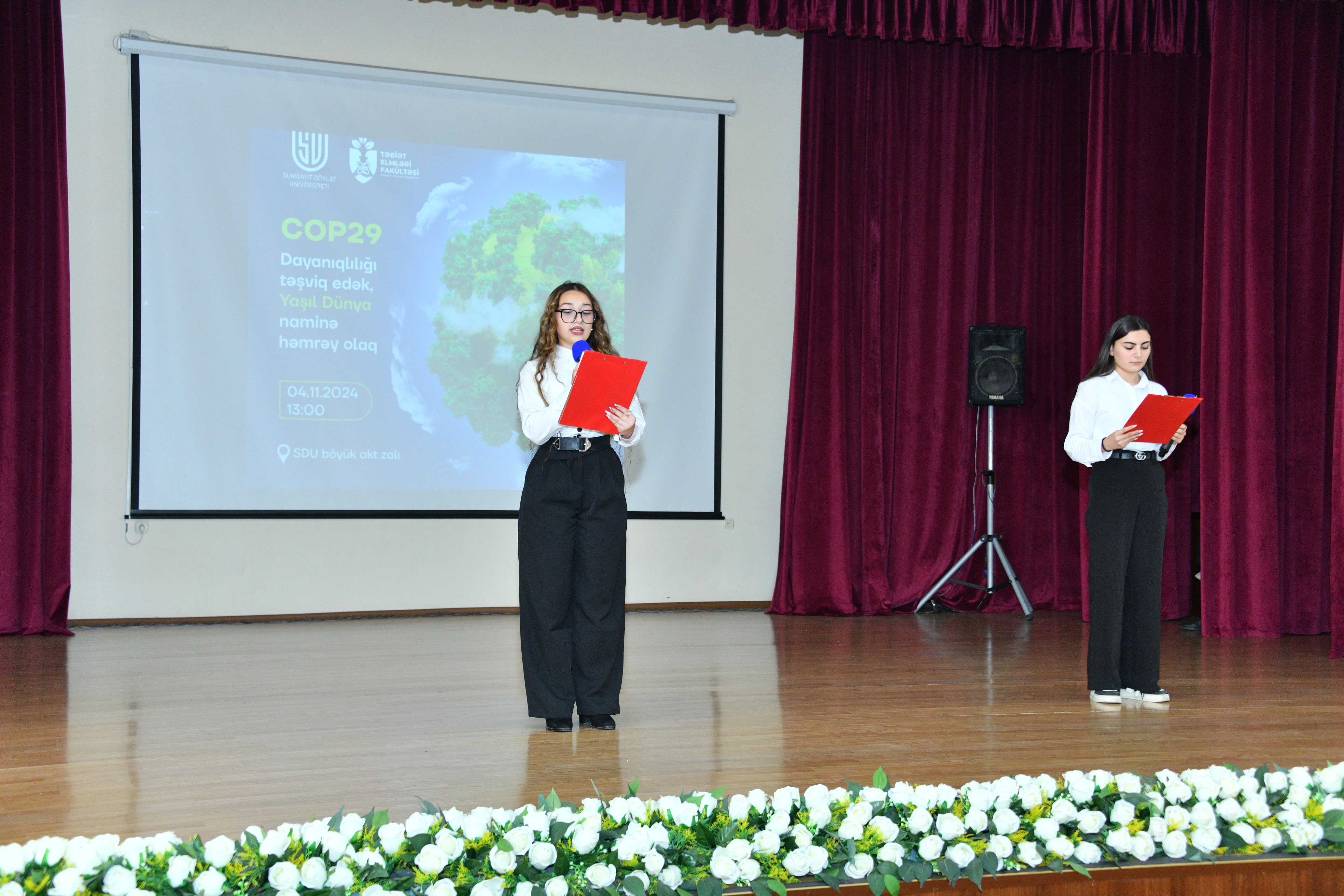 Noyabrın 4-də Sumqayıt Dövlət Universitetində Təbiət elmləri fakültəsinin təşkilatçılığı ilə ölkəmizin ev sahibliyi edəcəyi 29-cu “Tərəflərin konfransı (COP29)”na həsr olunmuş “COP29 Dayanıqlılığı təşviq edək, Yaşıl Dünya naminə həmrəy olaq” adlı tədbir keçirildi.Əvvəlcə iştirakçılar universitetin foyesində ekoloji maarifləndirməni özündə əks etdirən tullantılardan hazırlanmış əl işlərindən ibarət sərgi ilə tanış oldular. Tədbirdə fakültə dekanı dosent Rəşad Səlimov “İqlim dəyişkənliyi” mövzusunda çıxış edərək Dayanıqlı İnkişaf Məqsədlərinin (DİM) 13-cü məqsədi (İqlim dəyişikliyi və onun təsirlərinə qarşı mübarizə üzrə təcili tədbirlər görmək) haqqında məlumat verdi. O, iqlim dəyişmələrinin ətraf mühitə təsirindən, bəşəriyyətə vurduğu ziyanlardan, bu sahə üzrə tətbiq edilən qabaqlayıcı tədbirlərdən danışdı və ətraf mühitin qorunması naminə ekoloji maarifləndirmə tədbirlərinin həyata keçirilməsinin vacib məsələlərdən olduğunu qeyd etdi. Dekan ölkəmizdə COP29 tədbirlər planına uyğun olaraq Sumqayıt Dövlət Universitetində də bu istiqamətdə forum, sərgi, müxtəlif tədbirlərin təşkil olunduğunu diqqətə çatdırdı. Bildirdi ki, bu da gənc nəslin tərbiyəsində ekoloji dünyagörüşün formalaşmasına, ekoloji biliklərin artırılmasına və ölkəmizin qlobal iqlim siyasəti ilə bağlı apardığı birgə fəaliyyətə öz töhfəsini verir. Bütün bunlar qlobal iqlim dəyişikliyinin qarşısının alınması üçün təsirli vasitələrdən biri olan yaşıl enerji sektorunun inkişafında xüsusi əhəmiyyət daşıyır. Sonra “Təbiət” adlı videoçarx nümayiş olundu. “COP29 haqqında” Təbiət elmləri fakültəsinin I kurs tələbəsi Röya Əlizadə çıxış edərək COP nədir və COP29-a ev sahibliyi ölkəmizə nə verəcək? suallarına təqdimatı ilə aydınlıq gətirdi. Daha sonra tələbələr dünyaca məşhur pop ulduz Michael Jacksonun ‘Earth Song’ mahnısı ilə təbiətin hər kəsin qəlbində nə qədər dərin yer tutduğunu hazırladıqları səhnəciklə bir daha xatırlatdılar. Tələbələr həmçinin Simulyasiya- müharibələrin ekologiyaya təsirindən ibarət hazırladıqları digər səhnəciyi nümayiş etdirdilər. Ardınca “Dünyanın ağciyərləri” pantomim tamaşası göstərildi. Tədbirin sonunda “Earth where in it together” mesajı verildi.