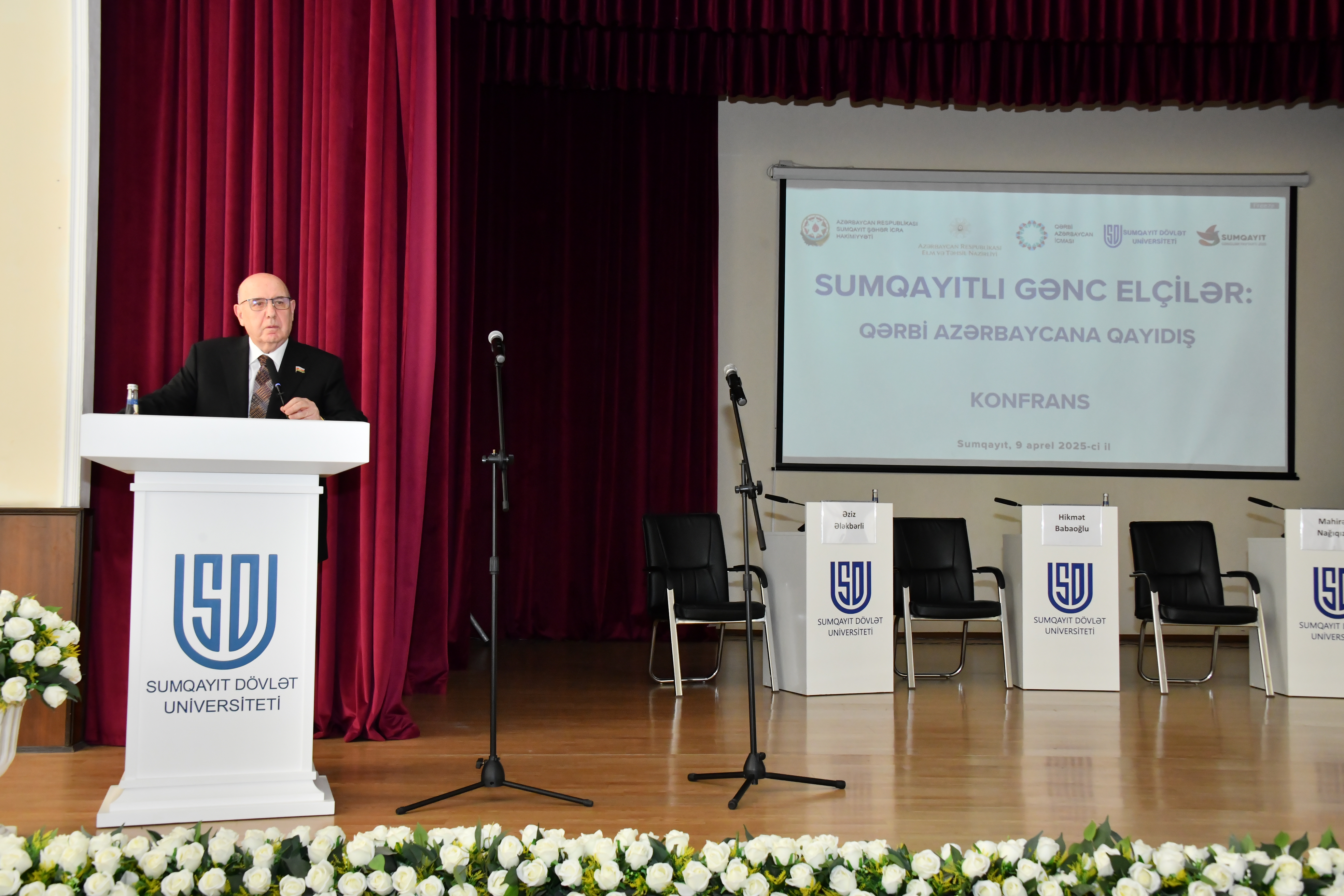 Aprelin 9-da Sumqayıt Dövlət Universitetində (SDU) “Sumqayıtlı gənc elçilər: Qərbi Azərbaycana qayıdış” mövzusunda konfrans keçirilib. Konfransda Elm və təhsil nazirinin müavini Firudin Qurbanov, Sumqayıt şəhər İcra Hakimiyyətinin başçısı Zakir Fərəcov, Qərbi Azərbaycan İcmasının İdarə Heyətinin sədri Əziz Ələkbərli, Qərbi Azərbaycan İcmasının Ağsaqqallar Şurasının sədri Əhliman Əmiraslanov, Qərbi Azərbaycan İcmasının üzvləri, Milli Məclisin deputatları, ictimaiyyət nümayəndələri, Sumqayıt Dövlət Universitetinin rəhbərliyi, professor-müəllim heyəti və tələbələr iştirak ediblər. Əvvəlcə SDU-nun rektoru v.i.e. professor Əminağa Sadıqov və qonaqlar universitetin foyesində ucaldılmış Ümummilli Lider Heydər Əliyevin büstü önünə gül dəstələri düzüblər. Sonra Qərbi Azərbaycana həsr olunmuş rəsm sərgisinə baxış keçirilib. Akt zalında davam edən konfransda Ulu Öndər Heydər Əliyevin və Vətən uğrunda canından keçmiş şəhidlərimizin əziz xatirələri bir dəqiqəlik sükutla yad olunub, Azərbaycan Respublikasının Dövlət Himni səsləndirilib.