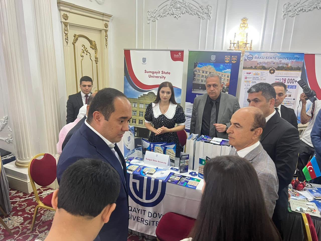 30-31 may 2025-ci il tarixlərində Daşkənd şəhərində “Study in Azerbaijan” təhsil sərgisi keçirilmişdir Sərgidə Sumqayıt Dövlət Universitetini rektoru v.i.e., professor Əminağa Sadıqovun başçılıq etdiyi nümayəndə heyəti təmsil edib. Sərgi Azərbaycan-Özbəkistan Hökumətlərarası Komissiyasının 13-cü iclasının protokolunda yer alan tapşırıqların icrası çərçivəsində təşkil olunmuş və hər iki ölkənin ali təhsil müəssisələrinin birbaşa qarşılıqlı əməkdaşlıq imkanlarını genişləndirmək məqsədi daşıyıb. Sərginin açılış mərasimində Azərbaycan Respublikasının elm və təhsil nazirinin müavini İdris İsayev, Özbəkistanın ali təhsil, elm və innovasiyalar nazirinin birinci müavini Şaxrux Daliyev və Azərbaycanın Özbəkistandakı fövqəladə və səlahiyyətli səfiri Hüseyn Quliyev çıxış edərək, tədbirin iki ölkə arasında təhsil və mədəni əməkdaşlığın inkişafında strateji rolunu vurğulayıblar.