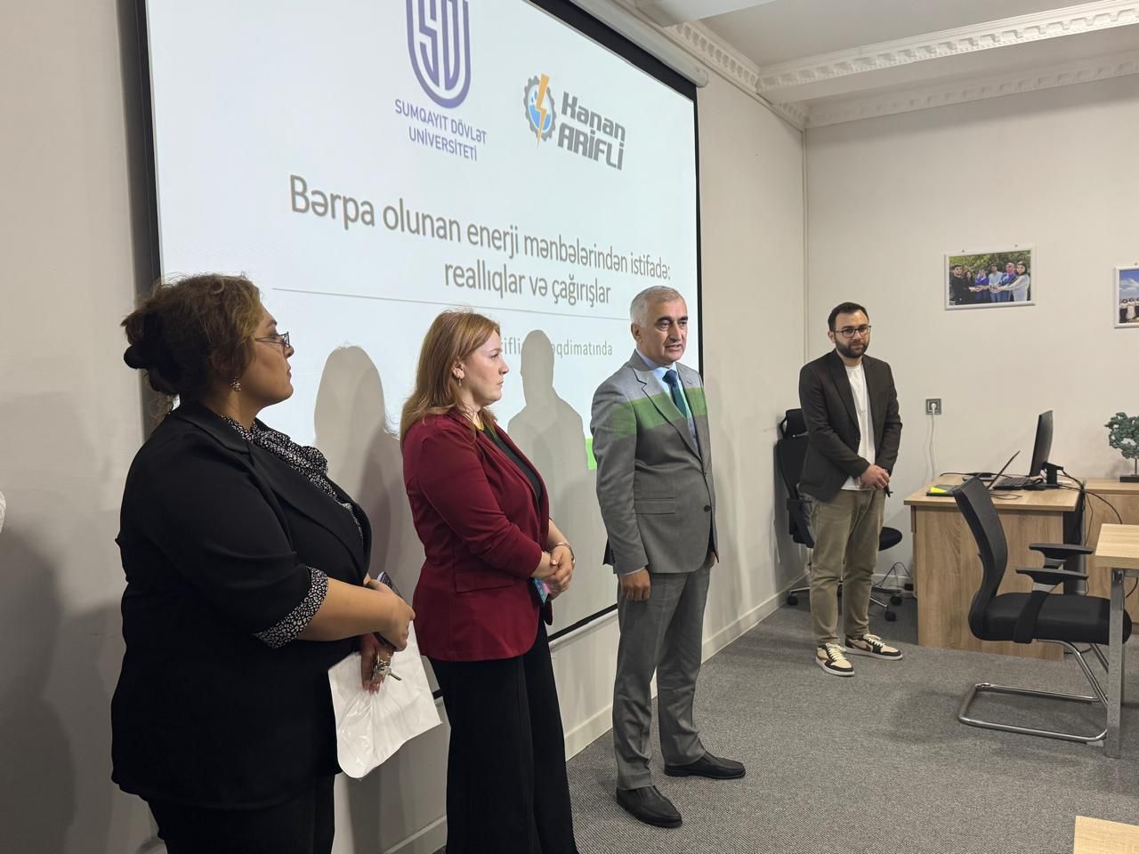 Aprelin 24-də Sumqayıt Dövlət Universitetinin (SDU) Mühəndislik fakültəsi Energetika kafedrasının təşəbbüsü və Karyera və Məzunlarla İş Mərkəzinin təşkilatçılığı ilə "Bərpa olunan enerji mənbələrindən istifadə: reallıqlar və çağırışlar" mövzusu üzrə təlim keçirilib.