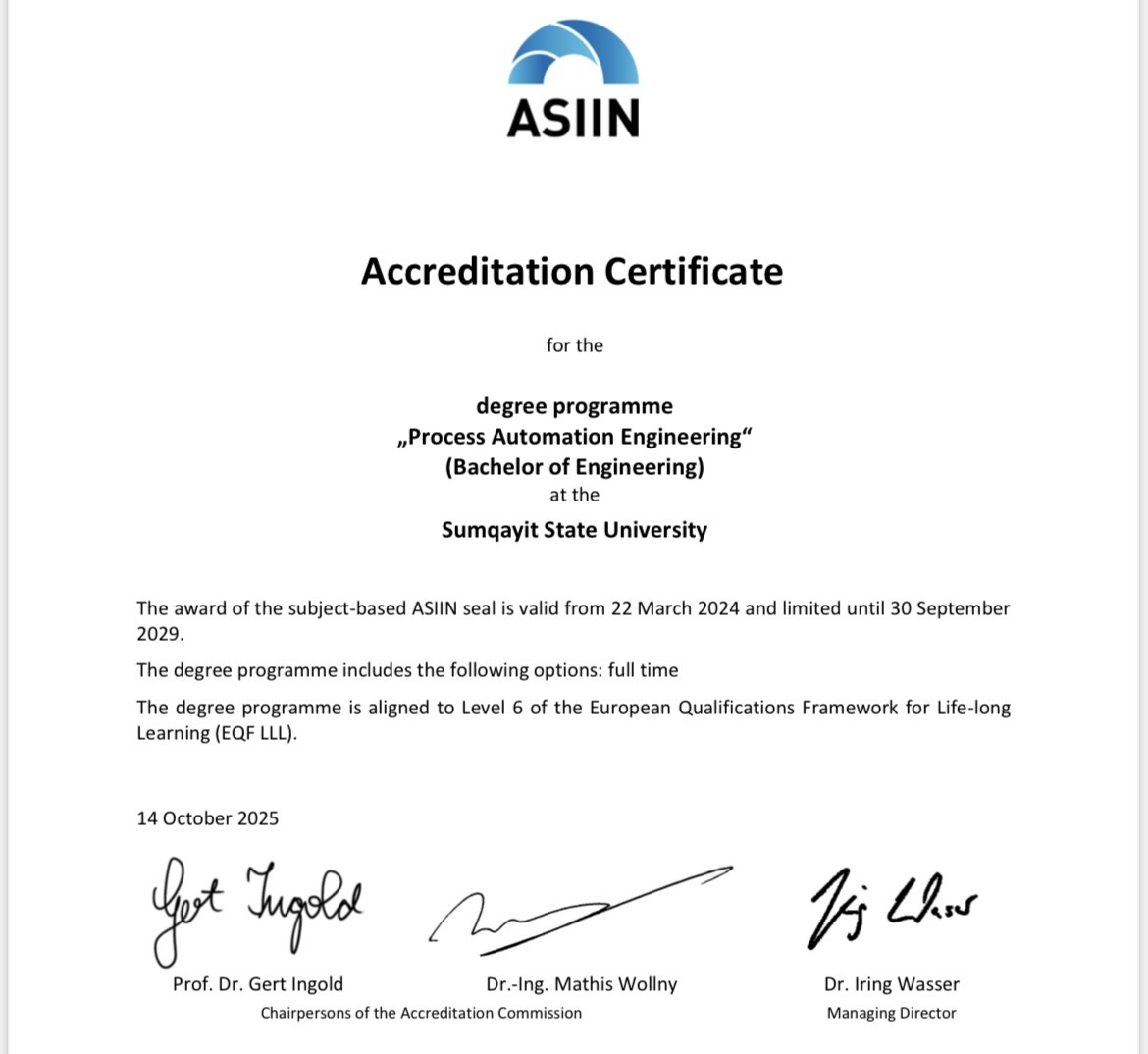 Sumqayıt Dövlət Universitetinin(SDU) “Proseslərin avtomatlaşdırılması mühəndisliyi” ixtisası beynəlxalq akkreditasiyadan uğurla keçərək mühüm nailiyyət əldə edib. Almaniyanın Düsseldorf şəhərində yerləşən nüfuzlu ASİİN beynəlxalq akkreditasiya agentliyi ilə Sumqayıt Dövlət Universiteti arasında imzalanmış 17 oktyabr 2022-ci il tarixli müqaviləyə əsasən, bakalavriat səviyyəsində tədris olunan “Proseslərin avtomatlaşdırılması mühəndisliyi” ixtisasının təhsil proqramının beynəlxalq akkreditasiyadan keçirilməsi prosesi həyata keçirilib. Bu məqsədlə ASİİN-in tələblərinə uyğun olaraq universitet tərəfindən geniş hesabatlar və müvafiq məlumatlar təqdim edilib. 2024-cü ilin 10–12 oktyabr tarixlərində agentliyin ekspert qrupu universitetdə qiymətləndirmə səfərində olub. Qrupun tərkibinə Chemnitz Universitetinin professoru sədr Madhukar Candra , Hamburq Tətbiqi Elmlər Universitetinin professoru Volfqanq Renz, Bosch şirkətindən Dr. Alfred Şulte, ADA Universitetinin tələbəsi İlhamə Novruzova və layihə koordinatoru Paulina Petracenko daxil idi. Ekspertlər universitetin Mühəndislik fakültəsinin laboratoriyalarına və auditoriyalarına baxış keçiriblər. Görüşlər zamanı tədris mühitinin müasir standartlara uyğunluğu, müəllimlərin peşəkar inkişafı, imtahan prosesləri, elmi-tədqiqat fəaliyyəti, tələbə mobilliyi və keyfiyyət təminatı mexanizmləri müzakirə olunub. Eyni zamanda, sənaye tərəfdaşları ilə görüşlər keçirilib, universitetin infrastruktur imkanları qiymətləndirilib. Aparılmış qiymətləndirmənin nəticəsinə əsasən, ASİİN akkreditasiya komissiyasının 14 oktyabr 2025-ci il tarixli qərarı ilə Sumqayıt Dövlət Universitetinin “Proseslərin avtomatlaşdırılması mühəndisliyi” ixtisası üzrə təhsil proqramı 2024–2029-cu illər üçün 5 il müddətinə beynəlxalq akkreditasiyadan müvəffəqiyyətlə keçmişdir.