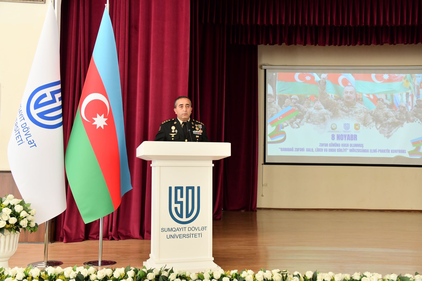 Noyabrın 7-də Sumqayıt Dövlət Universitetidə (SDU) Sumqayıt şəhər İcra Hakimiyyəti və Milli Müdafiə Universiteti ilə birgə Zəfər Gününün beşinci ildönümünə həsr olunmuş “Qarabağ zəfəri: xalq, lider və ordu birliyi” mövzusunda elmi-praktik konfrans keçirilib. Konfransda Sumqayıt Dövlət Universitetinin rəhbərliyi, professor-müəllim heyəti və tələbələr, həmçinin Sumqayıt şəhər İcra Hakimiyyətinin başçısı Zakir Fərəcov və Milli Müdafiə Universiteti rektorunun müşaviri general-leytenant Heydər Piriyev və digər yüksək rütbəli zabitlər, Sumqayıt hərbi prokuroru ədliyyə polkovniki Ağakişi Acalov, Səfərbərlik və Hərbi Xidmətə Çağırış üzrə Dövlət Xidmətinin Sumqayıt şəhər Baş İdarəsinin rəisi, general-mayor Natiq Qarayev, Vətən müharibəsi qəhrəmanı, polkovnik Raqif İsrayılov, şəhid ailə üzvləri iştirak ediblər. Tədbir iştirakçıları əvvəlcə Ulu Öndər Heydər Əliyevin universitetin foyesində ucaldılmış büstü və şəhidlik zirvəsinə ucalan tələbə-məzunların xatirə abidəsi önünə gül dəstələri düzüblər. Ardınca Zəfər Günü münasibətilə tələbələrin rəsm və əl işlərindən ibarət “Qaliblərin izində” müsabiqə-sərgiyə baxış keçirilib. Tədbirin rəsmi hissəsində Ulu Öndər və şəhidlərin xatirəsi bir dəqiqəlik sükutla yad edilib və Dövlət Himni səsləndirilib. Davamında “Zəfər” videoçarxı nümayiş olunub. Konfransı giriş sözü ilə universitetin rektoru, v.i.e., AMEA-nın müxbir üzvü, professor Əminağa Sadıqov açaraq, Zəfər Gününün beşinci ildönümü münasibətilə Prezident, Müzəffər Ali Baş Komandan İlham Əliyevi, Birinci vitse-prezident Mehriban xanım Əliyevanı, rəşadətli Azərbaycan Ordusunu və bütün Azərbaycan xalqını səmimi qəlbdən təbrik edib, xoş arzularını çatdırıb. O, Ulu Öndər Heydər Əliyevin təşəbbüsü və rəhbərliyi ilə əsası qoyulan hərbi quruculuq siyasətindən, ölkədə güclü və peşəkar ordunun formalaşdırılması istiqamətində görülmüş mühüm işlərdən bəhs edib. Professor Əminağa Sadıqov vurğulayıb ki, bu siyasət bu gün Prezident, Müzəffər Ali Baş Komandan İlham Əliyev tərəfindən uğurla davam etdirilir və onun qətiyyətli rəhbərliyi sayəsində Azərbaycan Ordusu regionun ən qüdrətli hərbi qüvvəsinə çevrilib. Onu da qeyd edib ki, qələbəmizin əsas dayağı üç mühüm sütuna söykənir — Azərbaycan xalqı, müdrik lideri və qəhrəman ordusu. Onun sözlərinə görə, sərkərdəsiz heç bir dövlət və ordu uğur qazana bilməz. “Biz xoşbəxt xalqıq ki, cənab İlham Əliyev kimi müdrik, qətiyyətli və uzaqgörən Ali Baş Komandanımız var,” – deyə professor Əminağa Sadıqov vurğulayıb. Qeyd edib ki, 44 günlük Vətən müharibəsi müasir elmi-texnoloji müharibə idi və Azərbaycan bu sınaqdan layiqincə keçdi. “Bu gün bizim hər sahədə yüksək ixtisaslı mütəxəssislərimiz var. Milli Müdafiə Universiteti ölkənin müdafiə potensialının gücləndirilməsi istiqamətində peşəkar kadrlar yetişdirir,” – deyə o əlavə edib. O, həmçinin bildirib ki, Azərbaycan xalqı bütün dünyaya öz qəhrəmanlığını və birliyini nümayiş etdirdi. Bu gün ölkəmizin bütün bölgələrində olduğu kimi, Sumqayıt Dövlət Universitetində də Zəfər Gününə həsr olunmuş silsilə tədbirlər həyata keçirilir və bu tədbirlər gənclərdə milli qürur hissinin daha da güclənməsinə xidmət edir. Onu da vurğulayıb ki, 44 günlük Vətən müharibəsində Azərbaycan xalqı “Dəmir yumruq” kimi vahid qüvvə olaraq çıxış edib, dövlət, xalq və ordunun birliyi sayəsində tarixi Zəfər qazanılıb. Əminağa Sadıqov həmçinin 44 günlük Vətən müharibəsi dövründə Sumqayıt şəhərindəki istehsal müəssisələrinin fəaliyyətindən və şəhər rəhbərliyinin şəhid ailələrinə göstərdiyi diqqət və qayğıdan bəhs edib. Sumqayıt şəhər İcra Hakimiyyətinin başçısı Zakir Fərəcov çıxış edərək qeyd edib ki, Zəfər Günü Azərbaycan xalqının tarixinə qızıl hərflərlə yazılmış, əsrlər boyu qeyd olunacaq möhtəşəm bayramdır. O, bu münasibətlə konfrans iştirakçılarını təbrik edib. İcra başçısı çıxışının əvvəlində Sumqayıt Dövlət Universitetinin şəhərin yeganə ali təhsil ocağı olaraq Sumqayıtın brendinə çevrildiyini, ölkənin nüfuzlu ali təhsil müəssisələrindən biri kimi şəhərin siyasi-ictimai, sosial və mədəni həyatında mühüm rol oynadığını vurğulayıb. Zakir Fərəcov çıxışında bu müharibənin tarixi köklərindən bəhs edərək, Ulu Öndər Heydər Əliyevin 1969–1982-ci illərdəki rəhbərliyi dövründə bir çox sahələrdə geridə qalmış Azərbaycanın qısa müddətdə böyük inkişaf yolu keçdiyini, bunun isə o vaxtki SSRİ rəhbərliyinin narahatlığına səbəb olduğunu və nəticədə Heydər Əliyevin vəzifədən uzaqlaşdırıldığını vurğulayıb. Qeyd edib ki, Heydər Əliyevin rəhbərlikdən getməsindən sonra Azərbaycan xalqı ağır sınaqlarla üz-üzə qaldı — Sumqayıt hadisələri, 20 Yanvar faciəsi, Xocalı soyqırımı və torpaqlarımızın 20 faizinin işğalı xalqımızın yaddaşında dərin izlər buraxdı. Lakin xalqın təkidli tələbi ilə Ulu Öndər yenidən hakimiyyətə qayıtdı və onun uzaqgörən siyasəti nəticəsində ölkədə sabitlik bərpa olundu, iqtisadi, diplomatik və sosial sahələrdə mühüm nailiyyətlər əldə edildi. İcra başçısı onu da qeyd edib ki, bu gün Ulu Öndərin siyasi xətti Prezident İlham Əliyev tərəfindən uğurla davam etdirilir. Dövlət başçısı bütün sahələrdə – iqtisadiyyatda, sənayedə, ordu quruculuğunda və beynəlxalq arenada böyük nailiyyətlərə imza atır.