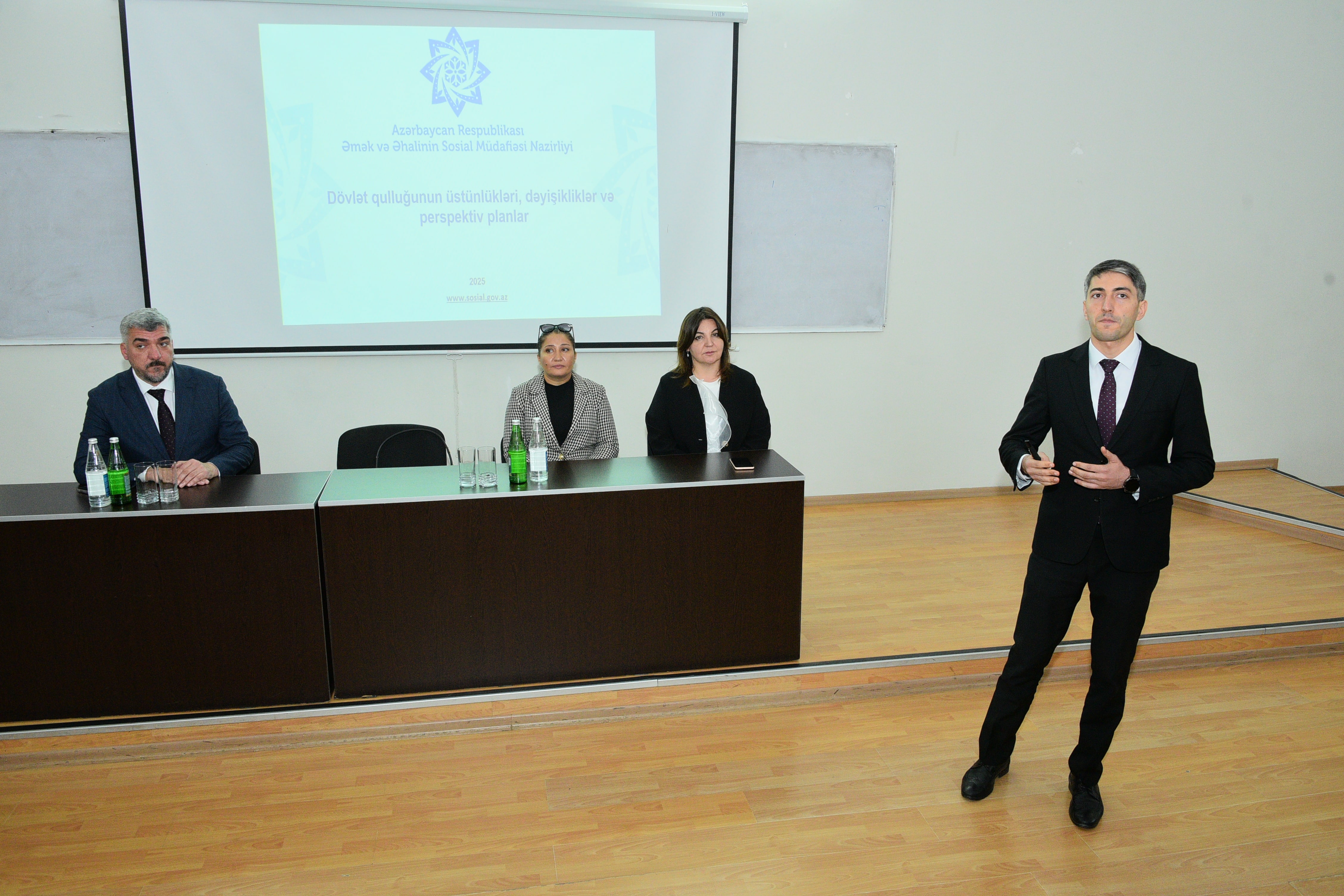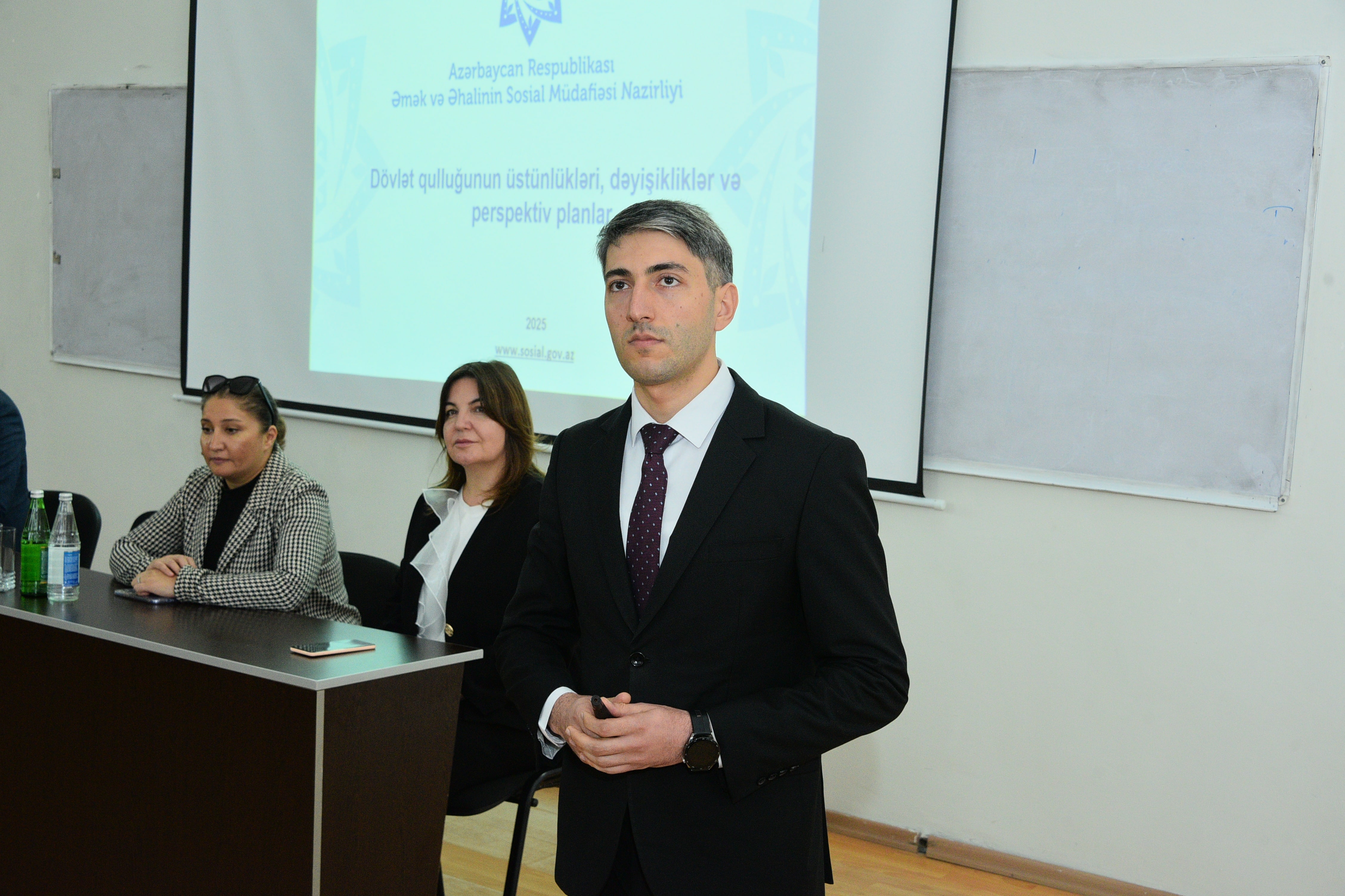 Noyabrın 14-də Sumqayıt Dövlət Universitetində Azərbaycan Respublikasının Əmək və Əhalinin Sosial Müdafiəsi Nazirliyinin (ƏƏSMN) əməkdaşlarının iştirakı ilə “Dövlət qulluğunun üstünlükləri, dəyişikliklər və perspektiv planlar” mövzusunda maarifləndirici seminar təşkil olunub. Tədbiri Karyera və Məzunlarla İş Mərkəzinin direktoru Anar Dünyamalıyev açaraq qonaqları salamlayıb və seminarın məqsədi barədə iştirakçılara məlumat verib. O, tədbirin gənclərdə dövlət qulluğuna marağın artırılması, tələbələrin bu sahə ilə bağlı bilgilərlə təmin olunması və onların gələcək karyera planlaşdırmasına dəstək göstərilməsi baxımından mühüm əhəmiyyət daşıdığını vurğulayıb. Sonra Əmək və Əhalinin Sosial Müdafiəsi Nazirliyinin baş məsləhətçisi Həsənağa Hüseynov çıxış edərək ölkəmizdə dövlət qulluğu sisteminin hüquqi bazası, dövlət qulluqçuları üçün mövcud təminatlar, qəbul prosedurları, imtahan və seçim mexanizmləri, müsabiqə mərhələləri barədə məlumat verib. O, dövlət qulluğuna qəbul prosesinin şəffaflıq və bərabər imkanlar prinsipləri əsasında həyata keçirildiyini bildirib, gənclərin dövlət idarəçiliyində artan rolundan danışıb. Seminar interaktiv şəkildə davam edib, tələbələrin çoxsaylı sualları cavablandırılıb. Gənclərə dövlət qulluğuna hazırlıq, imtahan strategiyaları və karyera inkişafı ilə bağlı bir sıra tövsiyələr verilib.