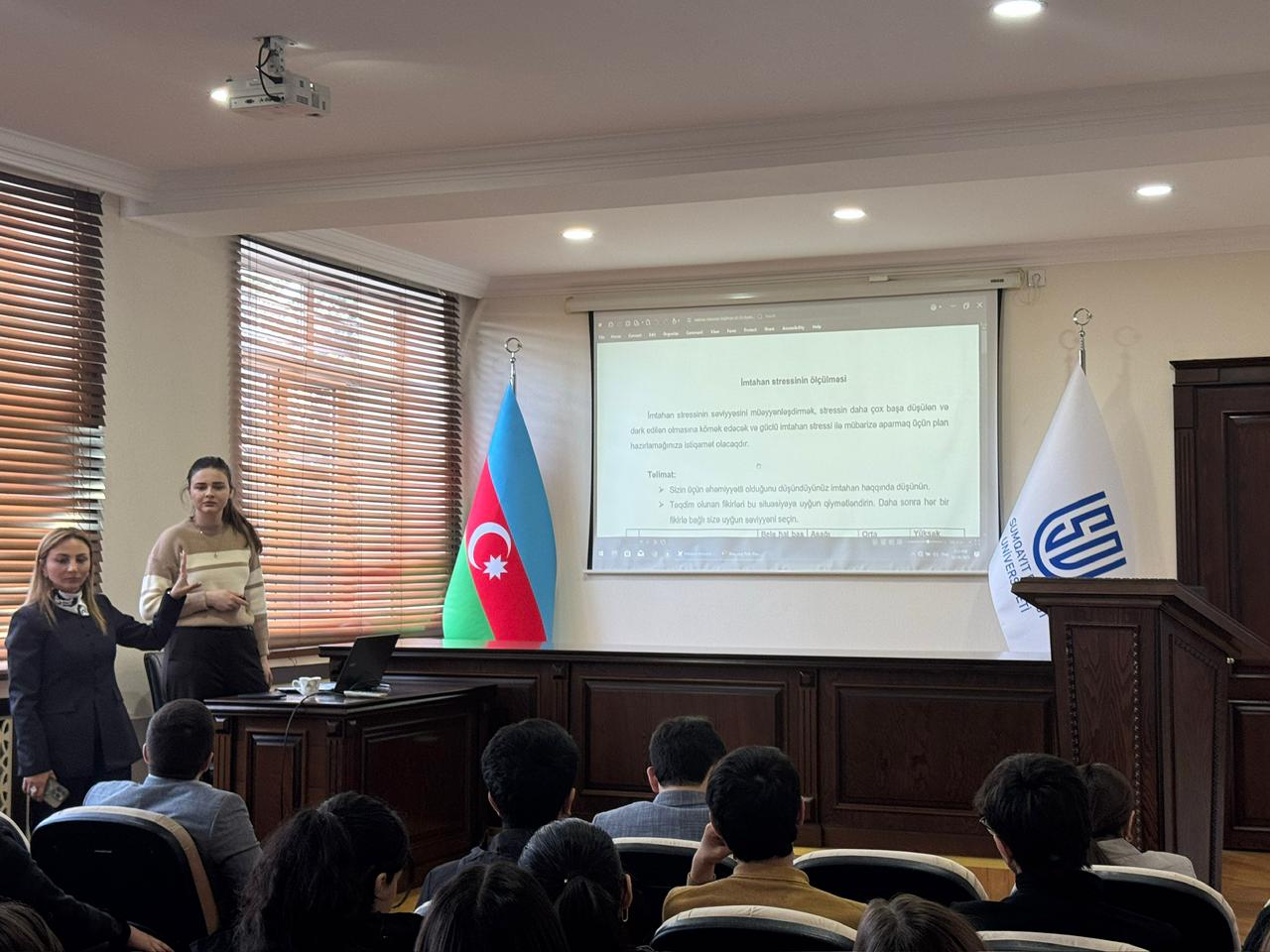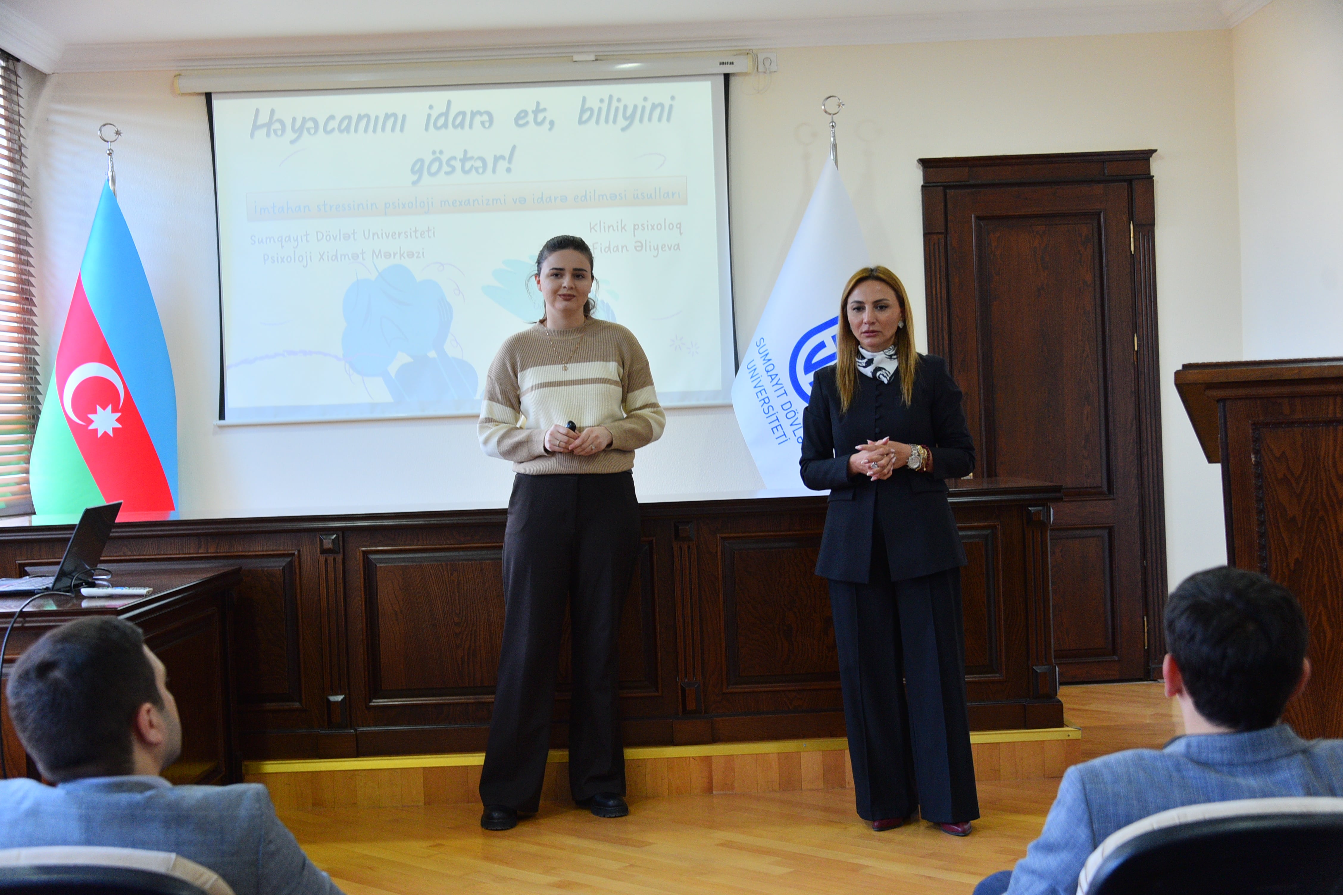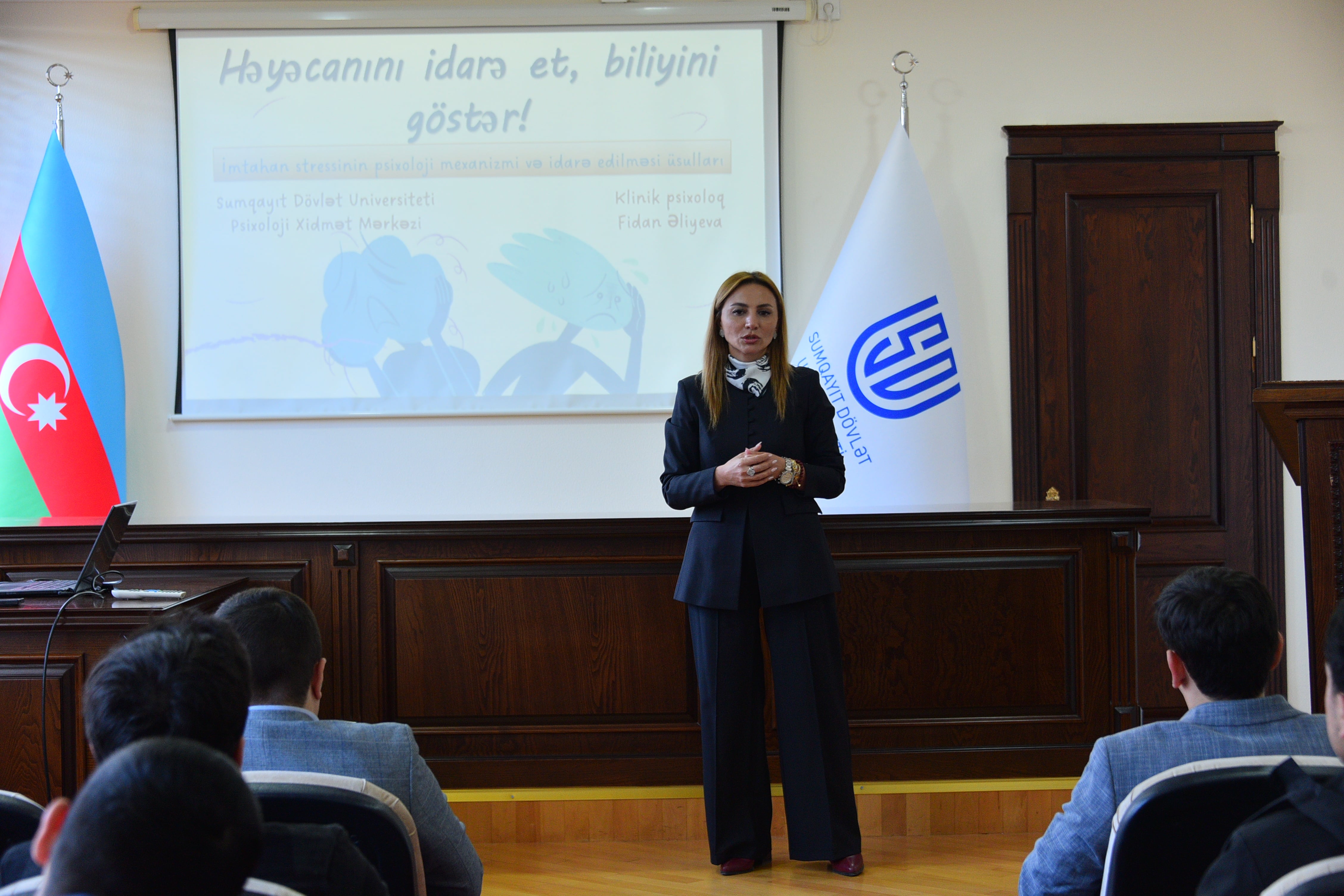 Dekabrın 19-da Sumqayıt Dövlət Universitetinin Psixoloji Xidmət Mərkəzi və Tələbə Həmkarlar İttifaqı Komitəsinin (THİK) birgə təşkilatçılığı ilə “Həyəcanını idarə et, biliyini göstər” mövzusunda maarifləndirici təlim keçirilib. Təlimi giriş sözü ilə açan Pedaqogika və psixologiya kafedrasının müdiri, dosent Aytəkin Məmmədova tələbələri salamlayaraq Psixoloji Xidmət Mərkəzinin fəaliyyəti haqqında məlumat verib. Dosent çıxışında imtahandan öncə yaranan narahatlıq və stressin psixoloji əsaslarına toxunaraq, psixoloq dəstəyi ilə bu həyəcanın idarə olunmasının mümkün olduğunu vurğulayıb. Bildirib ki, təlimin əsas məqsədi tələbələrdə imtahan stressinin elmi və praktik əsasları barədə biliklərin formalaşdırılması, eyni zamanda akademik fəaliyyət zamanı meydana çıxan gərginliyin effektiv şəkildə idarə olunmasına dair psixoloji bacarıqların inkişaf etdirilməsidir. Sonra Psixoloji Xidmət Mərkəzinin psixoloqu Fidan Əliyeva imtahan zamanı yaranan stressin səbəbləri, onu artıran əsas düşüncə amilləri və stressin idarə olunması yolları barədə məlumat verib. O, müasir psixoloji tədqiqatlara istinad edərək imtahan öncəsi və imtahan zamanı tətbiq oluna bilən effektiv stress idarəetmə üsullarından bəhs edib. Təlim çərçivəsində tələbələrə nəfəs texnikaları, pozitiv düşüncə strategiyaları, özünə inamın artırılması kimi praktik metodlar izah olunub. Eyni zamanda iştirakçılarla interaktiv müzakirələr aparılıb, praktiki tapşırıqlar yerinə yetirilib.