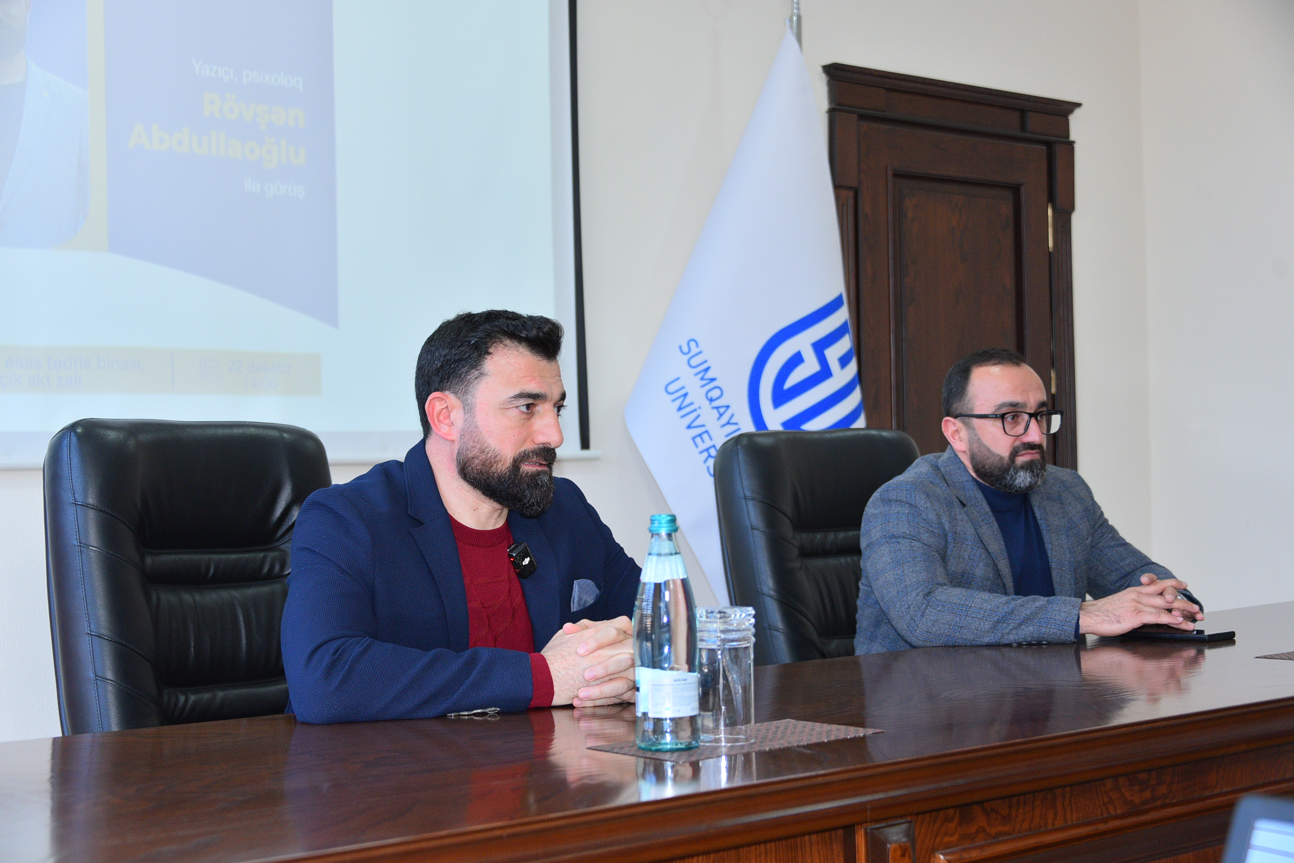Dekabrın 22-də Sumqayıt Dövlət Universitetində (SDU) Filologiya fakültəsinin Dil və ədəbiyyat kafedrasının, Tələbə Gənclər Təşkilatının və “Qədim Qala” nəşriyyatının birgə təşkilatçılığı ilə tanınmış yazıçı və psixoloq Rövşən Abdullaoğlu ilə görüş keçirilib. Tədbirdə universitetin professor-müəllim heyəti və tələbələr iştirak ediblər. Görüşü giriş sözü ilə açan “Qədim Qala” nəşriyyatının təmsilçisi Şöhlət İxtiyaroğlu bu cür görüşlərin tələbələrin dünyagörüşünün formalaşmasında, mütaliə mədəniyyətinin və ədəbi zövqünün inkişafında mühüm rol oynadığını vurğulayıb. O, müəllif-oxucu görüşlərinin əhəmiyyətindən danışaraq qeyd edib ki, Sumqayıt Dövlət Universitetində kitaba, müəllifə və oxucuya hər zaman böyük hörmətlə yanaşılır. Şöhlət İxtiyaroğlu həmçinin SDU ilə “Qədim Qala” nəşriyyatı arasında qurulmuş əməkdaşlığın uğurla davam etdiyini diqqətə çatdırıb, dünyada kitab sənayesinin inkişafından söz açıb və rəhbərlik etdiyi nəşriyyatın fəaliyyəti, həyata keçirilən layihələr barədə ətraflı məlumat verib. Sonra tanınmış yazıçı və psixoloq Rövşən Abdullaoğlu tələbələrlə görüşərək öz həyat yolu, yaradıcılıq fəaliyyəti və yazıçılıq təcrübəsi haqqında məlumat verib. Bildirib ki, yaradıcılıq fəaliyyətinə publisistik yazılarla başlayıb, zamanla bədii ədəbiyyata və digər janrlara üstünlük verib. Yazıçı qeyd edib ki, əsərlərində əsasən insan psixologiyası, həqiqət axtarışı, insanın daxili aləmi və onu narahat edən problemlər əsas mövzulardandır. Rövşən Abdullaoğlu çıxışında düzgün ixtisas seçiminin əhəmiyyətindən, gənclərin ailə və sosial mühitdə üzləşdikləri psixoloji çətinliklərdən, eləcə də şəxsi və peşəkar inkişaf yollarından bəhs edib. O, gənclərə öz potensiallarını düzgün dəyərləndirməyi, daxili imkanlarını kəşf etməyi və məqsədyönlü şəkildə inkişaf etməyi tövsiyə edib. Yazıçı öz əsərləri haqqında danışaraq bədii yaradıcılığın incə məqamlarına toxunub, ədəbiyyat və psixologiyanın bir-birini necə tamamladığını konkret nümunələrlə izah edib. Səmimi və intellektual müzakirələr şəraitində keçən görüş tələbələrin böyük marağına səbəb olub, sual-cavab formatında davam edib.