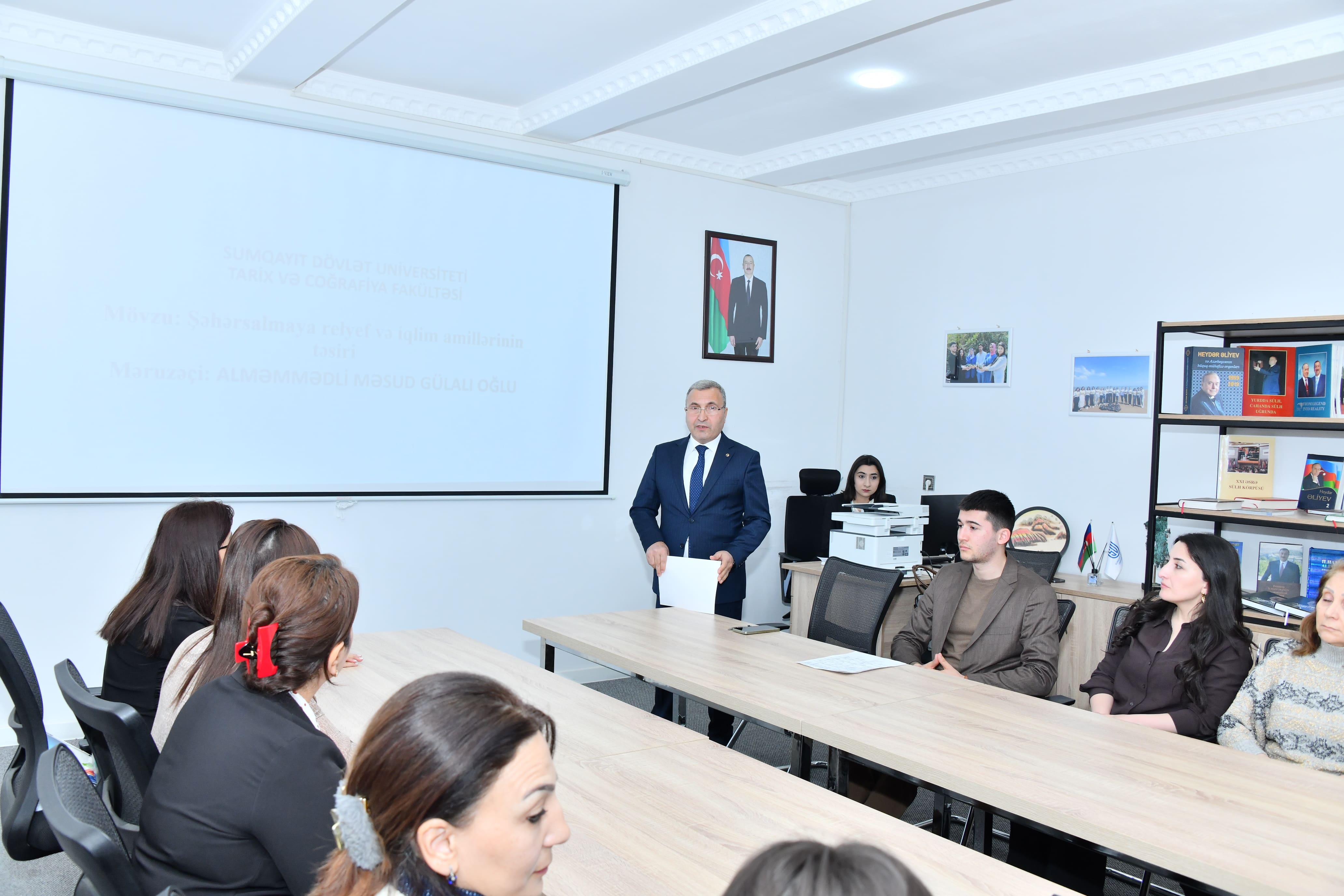 Sumqayıt Dövlət Universitetinin Tarix, coğrafiya və metodika kafedrasının təşkilatçılığı ilə “Memarlıq və Şəhərsalma İli”nə həsr olunmuş “Şəhərsalmanın coğrafi amilləri” mövzusunda elmi-praktik seminar keçirilib. Seminarı Tarix və coğrafiya fakültəsinin dekanı, professor Adil Baxşəliyev açaraq Azərbaycan Respublikasında 2026-cı ilin “Şəhərsalma və Memarlıq İli” elan olunmasının əhəmiyyətindən danışıb. Bildirib ki, bununla əlaqədar olaraq respublikanın bütün bölgələrində və müvafiq müəssisələrdə tədbirlər keçirilir. Bu istiqamətdə Elm və Təhsil Nazirliyinin Tədbirlər Planına əsasən Sumqayıt Dövlət Universitetində də silsilə tədbirlər təşkil olunur. Həmin tədbirlər fakültədə də davam edir. Professor çıxışı zamanı xüsusilə vurğulayıb ki, 2026-cı ilin “Şəhərsalma və Memarlıq İli” elan olunması təsadüfi deyil. Azərbaycanın şəhərsalma və memarlıq irsi qədim tarixi köklərə malikdir. Bu gün işğaldan azad edilmiş ərazilərdə geniş quruculuq və abadlıq işləri sürətlə aparılır. Belə tədbirlər müasir şəhərsalma prinsipləri baxımından xüsusi əhəmiyyət daşıyır. Həmin ərazilərin sosial-iqtisadi inkişafında və müasir şəhər mühitinin formalaşmasında hər kəs fəal iştirak etməlidir. Sonra Tarix, coğrafiya və metodika kafedrasının baş müəllimi, coğrafiya üzrə fəlsəfə doktoru Məsud Alməmmədli “Şəhərsalmaya relyef və iqlim amillərinin təsiri”, həmin kafedranın müəllimi Nərmin Əhmədova “Şəhərsalmanın landşaft planlaşdırılması” və fakültənin IVkurs tələbəsi Ellada Zərgərova “Şəhərsalmada coğrafi mövqeyin rolu” mövzularında çıxış ediblər. Çıxışçılar bildiriblər ki, şəhərsalma prosesində relyef və iqlim mühüm təbii amillər kimi çıxış edir, landşaft planlaşdırılması isə yaşayış məntəqələrinin yerləşmə prinsiplərinə, memarlıq həllərinə, həmçinin nəqliyyat və digər infrastrukturun inkişafına birbaşa təsir göstərir. Daha sonra Tarix, coğrafiya və metodika kafedrasının müdiri, dosent Sona Məhərrəmova çıxış edərək dinlənilən məruzələri yüksək qiymətləndirib və şəhərsalmanın müxtəlif aspektləri barədə fikirlərini bölüşüb. O, mövzunun aktuallığını və elmi-praktik əhəmiyyətini vurğulayıb. Seminar mövzu ətrafında müzakirələrlə davam edib.
