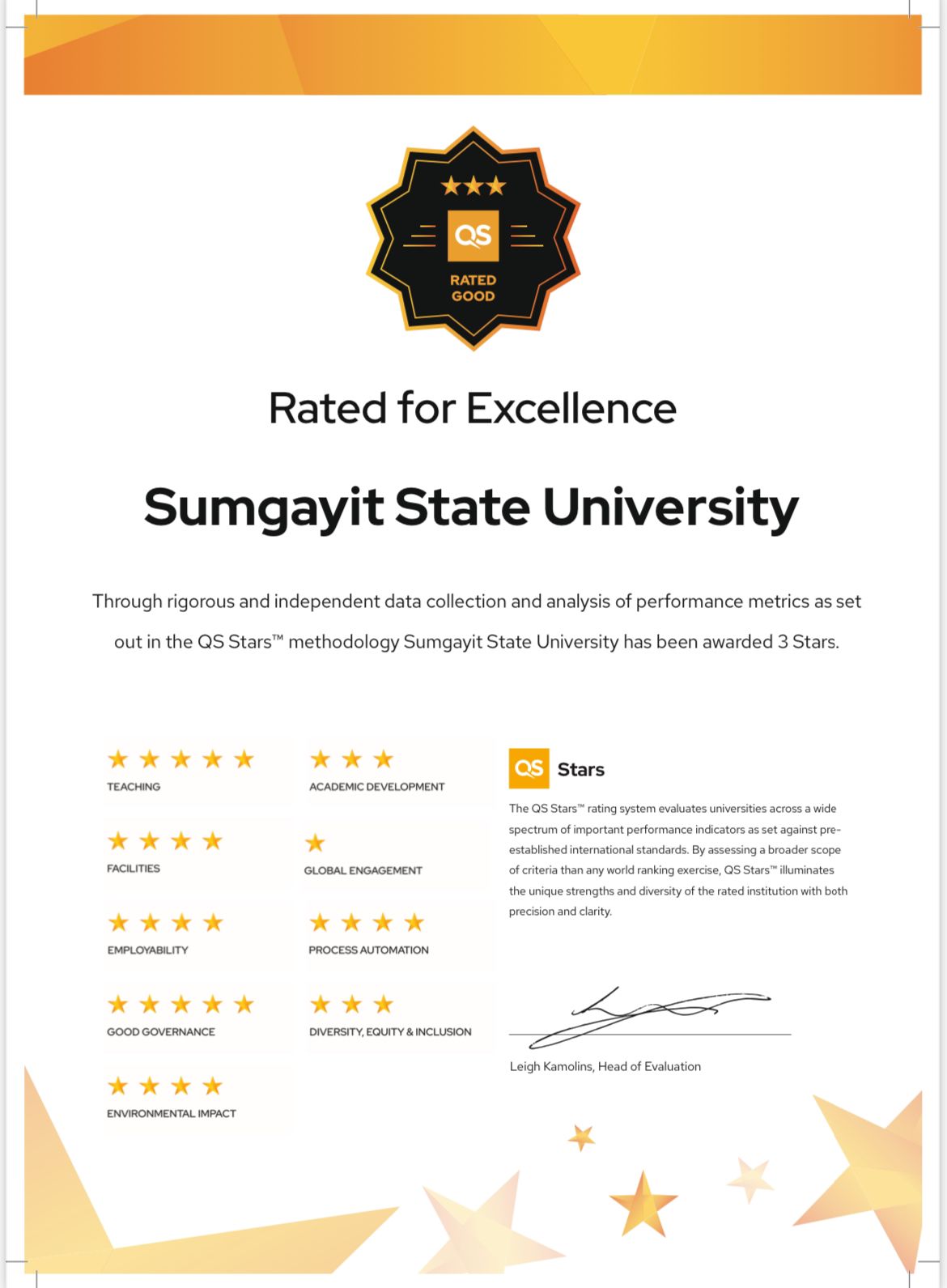 Sumqayıt Dövlət Universiteti (SDU) “Quacquarelli Symonds” (QS) qlobal reytinq agentliyi tərəfindən aparılan “QS Stars” audit qiymətləndirməsində iştirak edib. Nəticələrə ə... Davamı