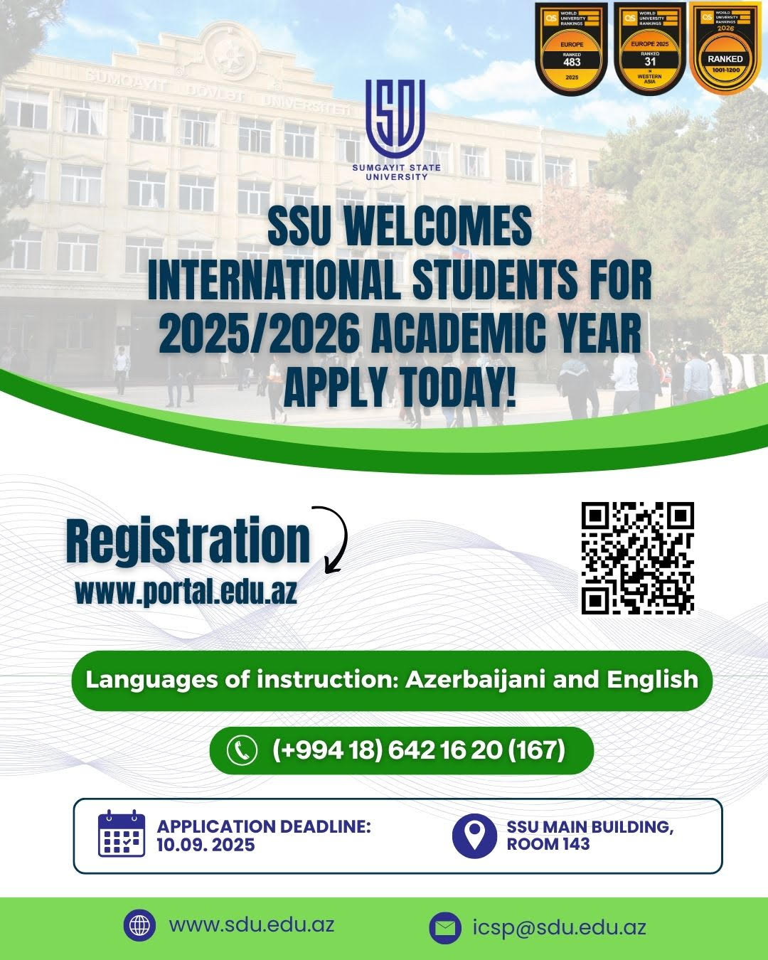 2025/2026-cı tədris ilində Sumqayıt Dövlət Universitetinin hazırlıq kursu, bakalavr və ya magistratura səviyyələrində təhsil almaq istəyən əcnəbi vətəndaşlar elektron qaydada (portal.edu.az) m&uu... Davamı