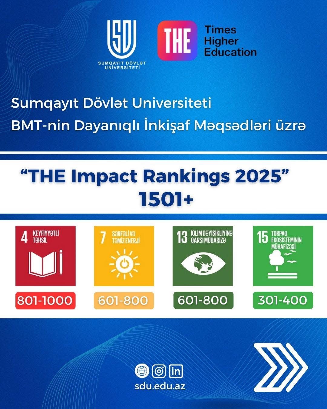 Sumqayıt Dövlət Universiteti ilk dəfə olaraq dünyanın nüfuzlu Times Higher Education (THE) Impact Rankings 2025 reytinqində iştirak etmiş və dünyanın aparıcı universitetləri arasın... Davamı